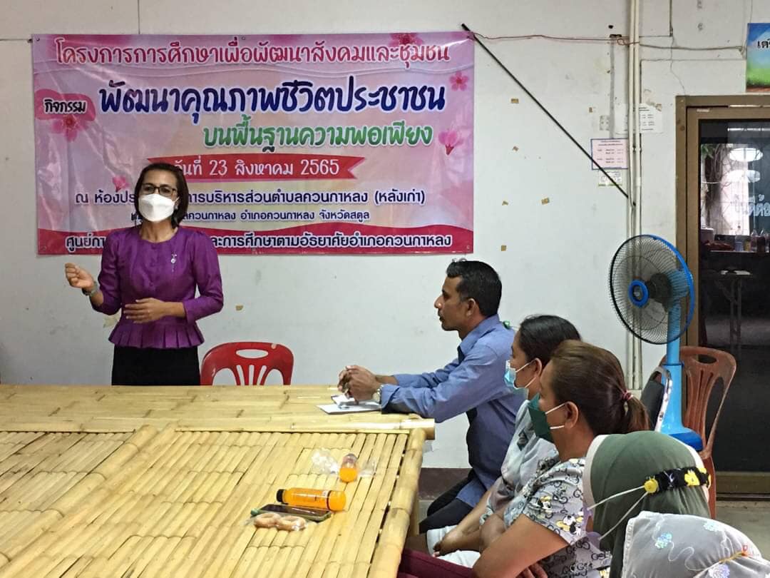 นายทวีศักดิ์ แซ่เจน ครูชำนาญการ รักษาการในตำแหน่งผู้อำนวยการศูนย์ กศน.อำเภอควนกาหลง มอบหมายให้ นางธิราวดี อินทานุกูล ครูผู้ช่วย เปิดโครงการการศึกษาเพื่อพัฒนาสังคมและชุมชน กิจกรรมพัฒนาคุณภาพชีวิตประชาชนบนพื้นฐานความพอเพียง
