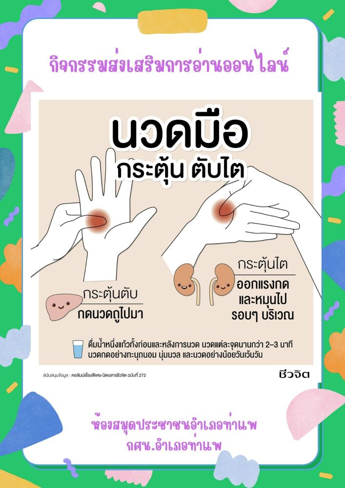 นางสาววชิรา คงพูล บรรณารักษ์ ห้องสมุดประชาชนอำเภอท่าแพ จัดกิจกรรมส่งเสริมการอ่านออนไลน์"นวดมือ กระตุ้น ตับไต" เพื่อส่งเสริมการอ่านให้กับประชาชนที่สนใจ มีความรู้ในการตรวจเช็คร่างกายตนเอง