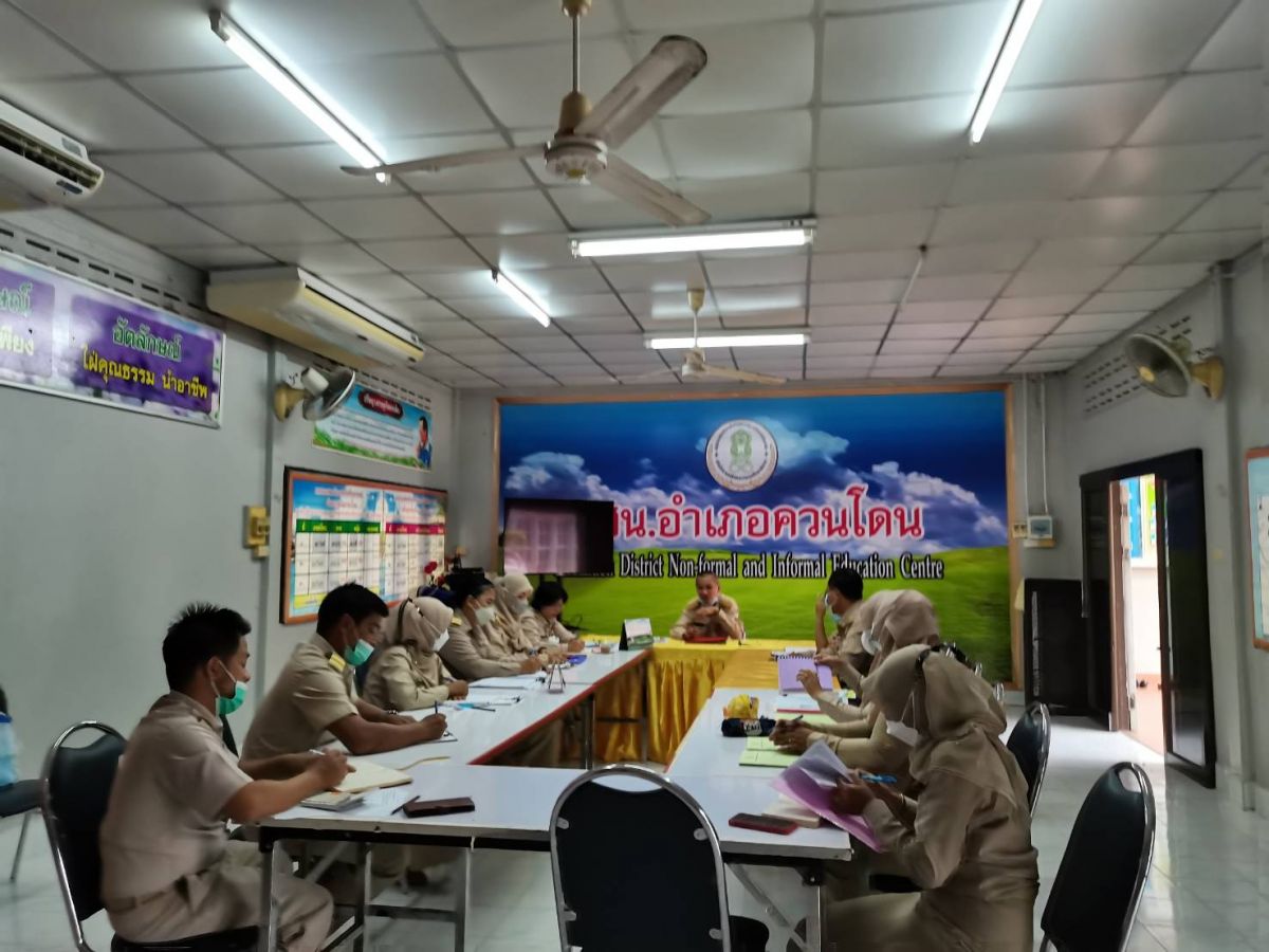 นายคณาธิป บุญญารัตน์ รองผู้อำนวยการสำนักงาน กศน.จังหวัดสตูล รักษาการในตำแหน่งผู้อำนวยการ กศน.อำเภอควนโดน จังหวัดสตูล เป็นประธานและดำเนินการประชุมบุคลากรในสังกัด กศน.อำเภอควนโดน เพื่อติดตามการจัดการจัดกิจกรรมพัฒนาผู้เรียน ประจำภาคเรียนที่ 1 ปีการศึกษา 2565 ณ ห้องประชุม กศน.อำเภอควนโดน จังหวัดสตูล