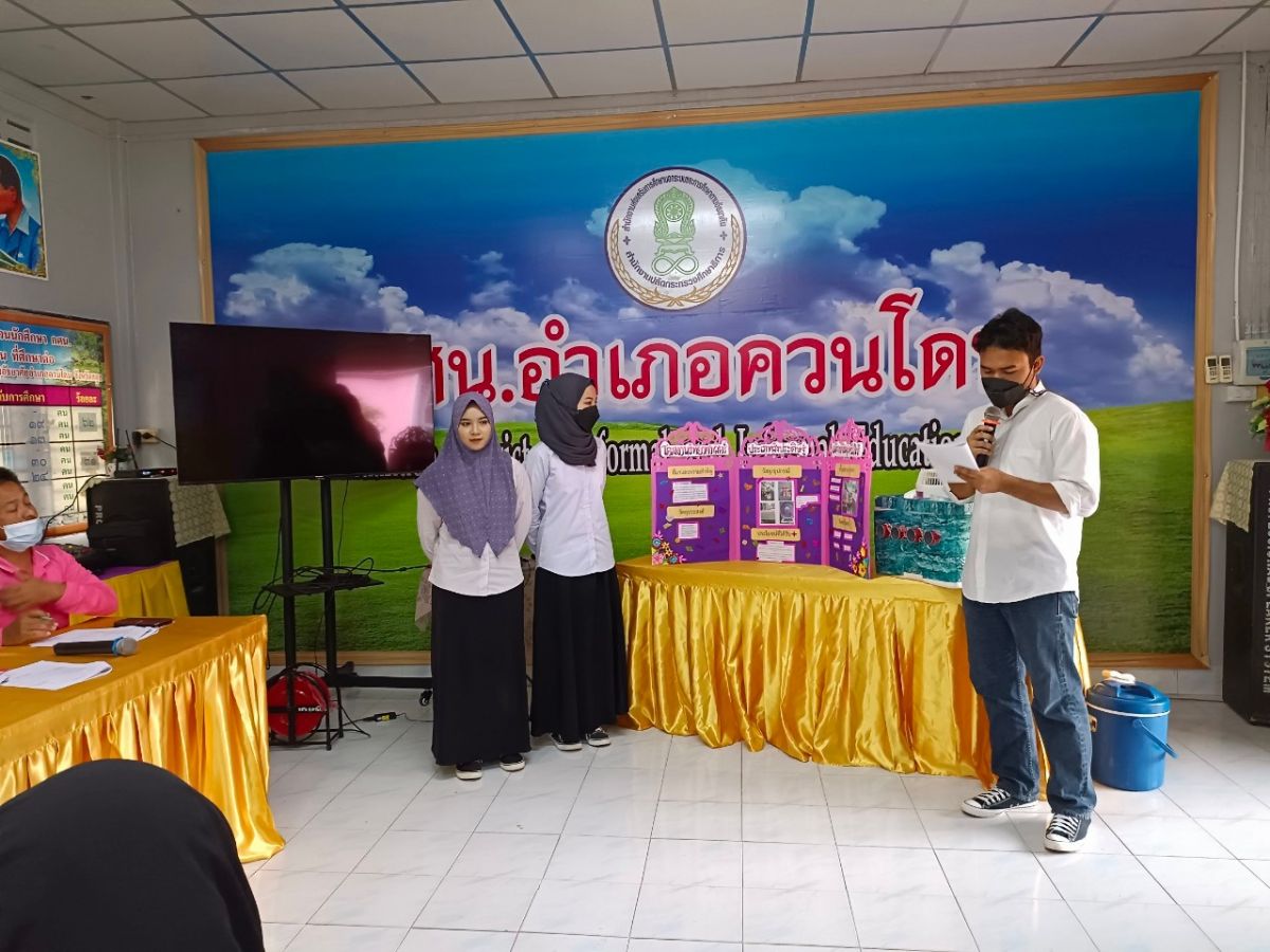 นางสาวฮาบีบะห์ เจะสมอเจ๊ะ ครู กศน.และนายอนันต์ ลัสมาน ครูอาสาสมัคร กศน. ได้รับมอบหมายจากนายคณาธิป บุญญารัตน์ รองผู้อำนวยการ สำนักงาน กศน.จังหวัดสตูล รักษาการในตำแหน่ง ผู้อำนวยการ กศน.อำเภอควนโดน จังหวัดสตูล นำนักศึกษา กศน.ตำบลย่านซื่อ ส่งโครงงานเข้าร่วมประกวดโครงงานนักศึกษา ประจำภาคเรียนที่ 1 ปีการศึกษา 2565 โดยมีวัตถุประสงค์ในการจัดเพื่อส่งเสริมการจัดกิจกรรมการเรียนรู้โครงงานวิทยาศาสตร์สำหรับนักศึกษา กศน. และเพื่อส่งเสริมความรู้ความเข้าใจกระบวนการทางวิทยาศาสตร์เทคโนโลยี และการใช้พลังงานไฟฟ้าให้กับนักศึกษา กศน. ณ ห้องประชุม กศน.อำเภอควนโดน จังหวัดสตูล