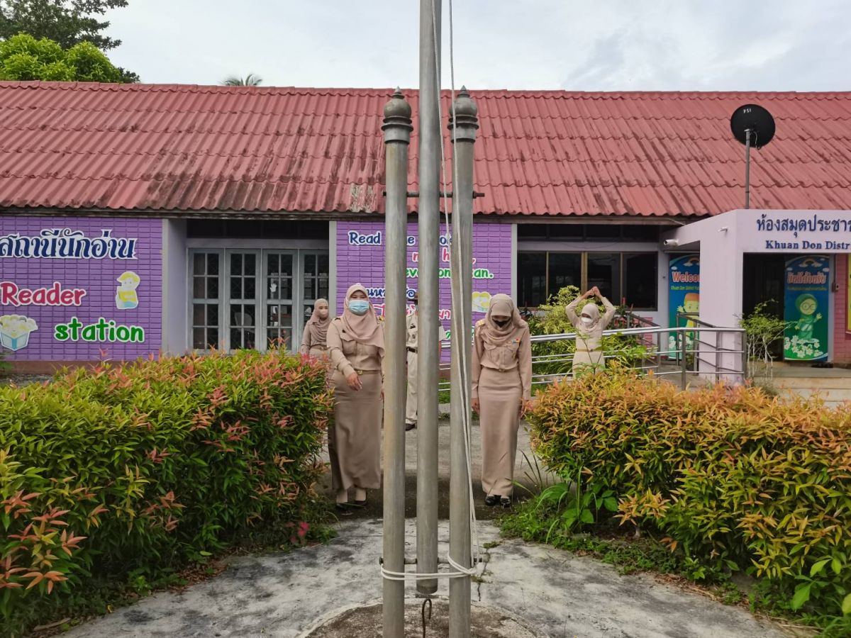 นางสาวสุนีย์ ไมมะหาด ครู กศน.ตำบลควนสตอ และนางรัตติยา ทรุพงษ์ ครูอาสาสมัครฯ กศน.ตำบลควนสตอ พร้อมด้วยบุคลากรในสถานศึกษา ได้รับมอบหมายจาก นายคณาธิป บุญญารัตน์ รองผู้อำนวยการสำนักงาน กศน.จังหวัดสตูล รักษาการในตำแหน่งผู้อำนวยการ กศน.อำเภอควนโดน จังหวัดสตูล ดำเนินกิจกรรมเข้าแถวเคารพธงชาติ ทำกิจกรรมทางศาสนา เพื่อแสดงความจงรักภักดีต่อสถาบันชาติ ศาสนา และพระมหากษัตริย์ โดยเป็นไปตามมาตรการป้องกันการแพร่ระบาดของโรคติดเชื้อไวรัสโคโรนา 2019 หรือ (COVID-19) ณ บริเวณหน้าเสาธง กศน.อำเภอควนโดน จังหวัดสตูล