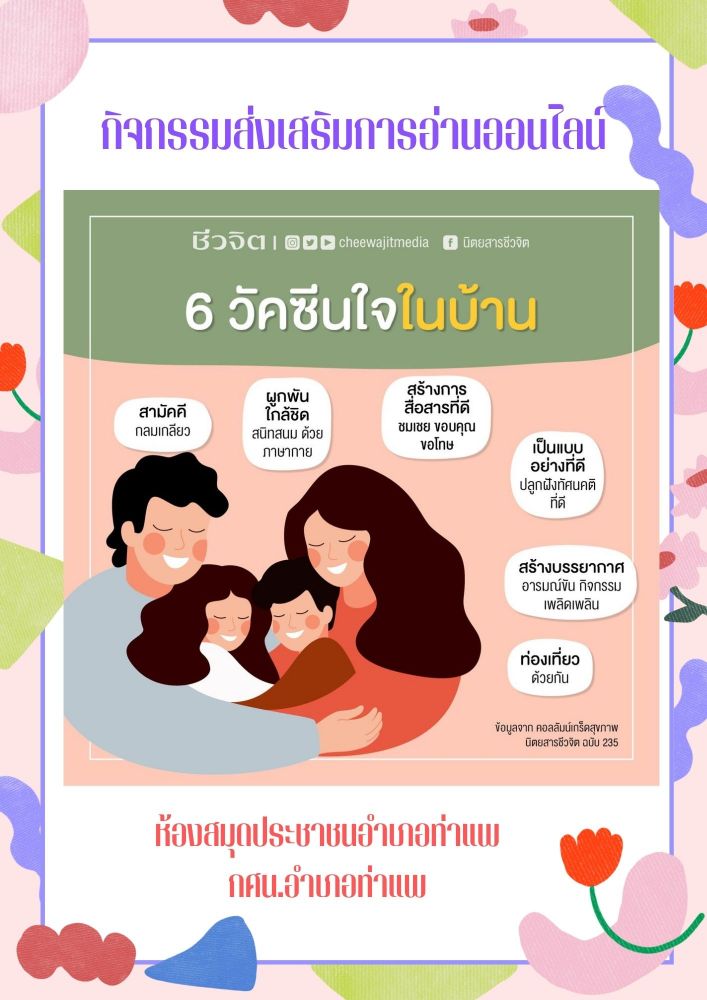 นางสาววชิรา คงพูล บรรณารักษ์ ห้องสมุดประชาชนอำเภอท่าแพจัดกิจกรรมส่งเสริมการอ่านออนไลน์"6 วัคซีนใจในบ้าน" เพื่อส่งเสริมการอ่านให้กับประชาชนที่สนใจ การปฏิบัติตนภายในบ้านให้มีความสุข