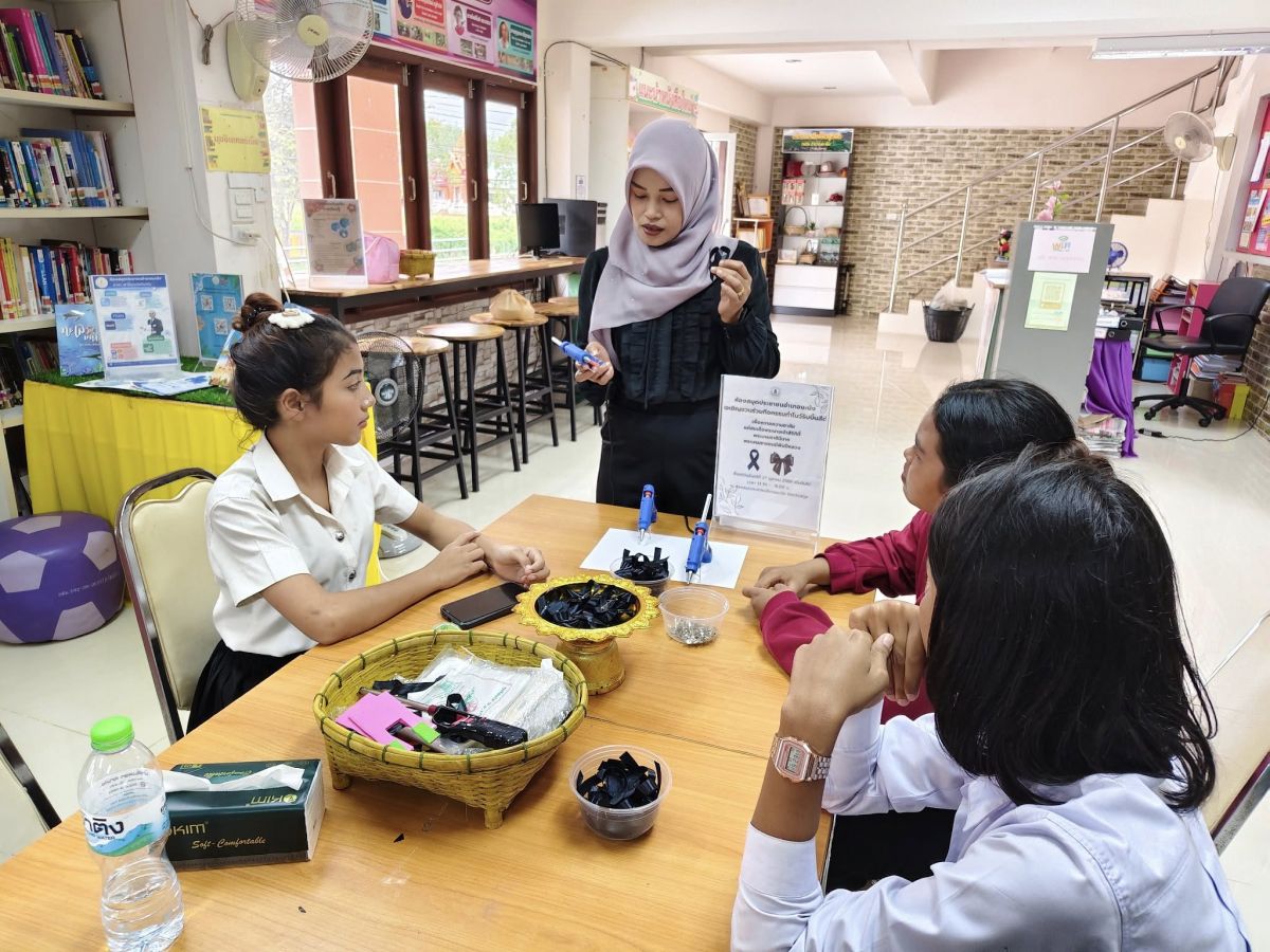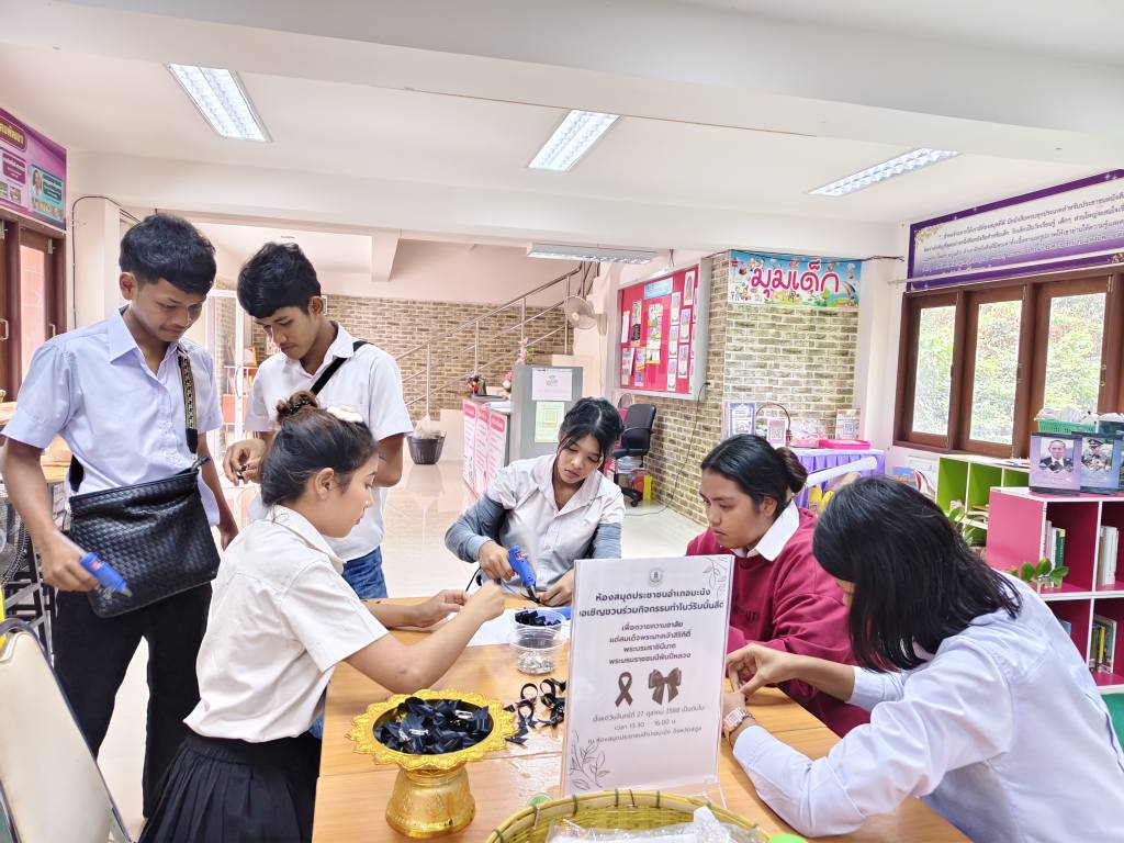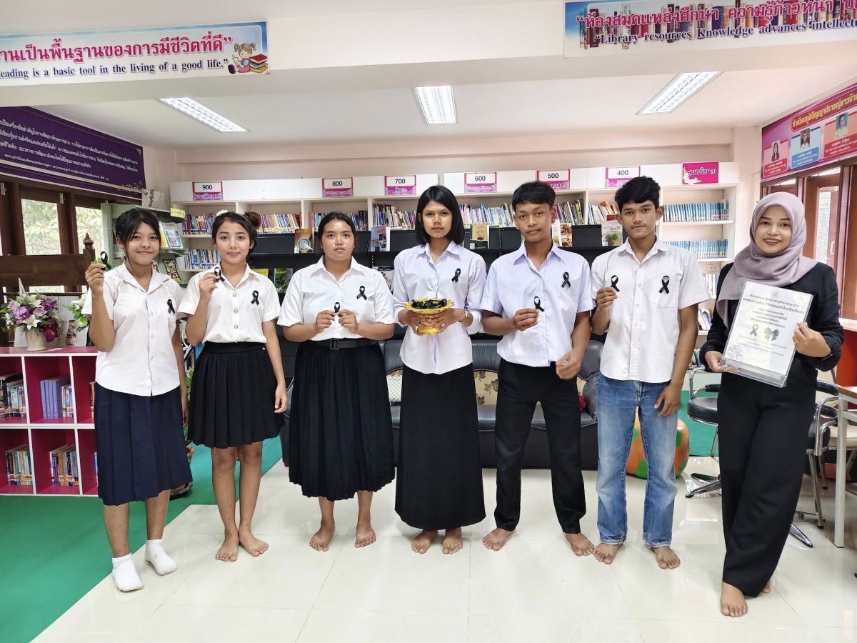 นายบุญนำ หมีนยะลา ผู้อำนวยการศูนย์ส่งเสริมการเรียนรู้ระดับอำเภอมะนัง มอบหมายให้นางสาวนริสรา พงค์หลง บรรณารักษ์ห้องสมุดประชาชนอำเภอมะนัง นำนักศึกษาเข้า ร่วมกิจกรรม “ร้อยดวงใจ ทำริบบิ้นดำ ถวายอาลัย” และแนะแนวทางการแต่งกายสำหรับช่วงไว้อาลัย