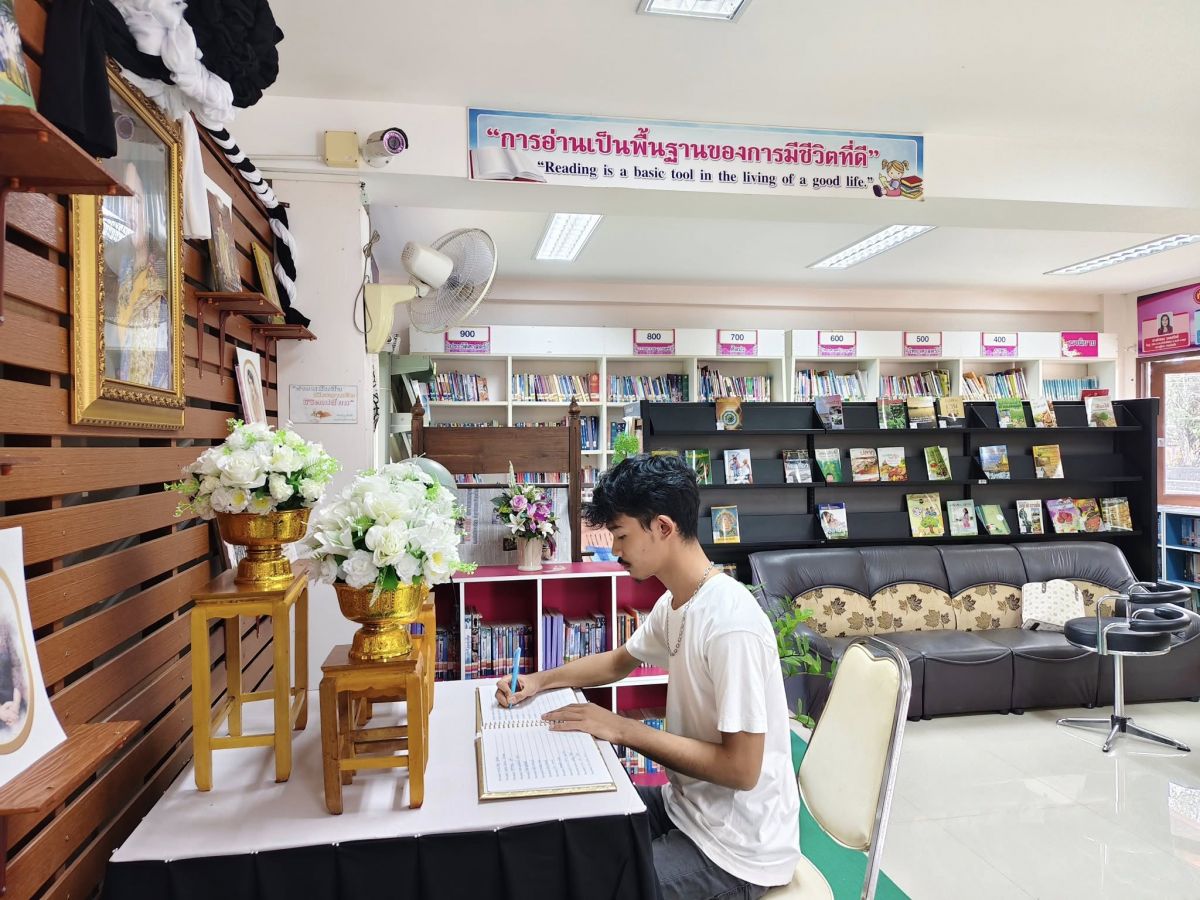 ห้องสมุดประชาชนอำเภอมะนัง นำนักศึกษาเข้าร่วมกิจกรรม ร้อยดวงใจ ทำริบบิ้นดำ ถวายอาลัย
