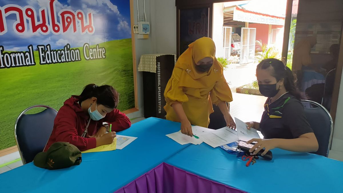 นางเนาวรัตน์ ศรีหมั่น ครู ชำนาญการรักษาการในตำแหน่ง ผู้อำนวยการ กศน.อำเภอควนโดน มอบหมายให้นางสาวฮาบีบะห์ เจ๊ะสมอเจ๊ะ ครู กศน.ตำบลควนโดน รับสมัครนักศึกษาใหม่ ประจำภาคเรียนที่ 2 ปีการศึกษา 2564 เพื่อส่งเสริม สร้างโอกาส ให้เด็ก เยาวชน และประชาชนที่พลาดโอกาสทางการศึกษา ได้ศึกษาเล่าเรียนต่อไป โดยดำเนินการเป็นไปตามแนวปฏิบัติการควบคุมและป้องกันการแพร่ระบาดของโรคติดเชื้อไวรัสโคโรน่า 19 ณ กศน.อำเภอควนโดน จังหวัดสตูล