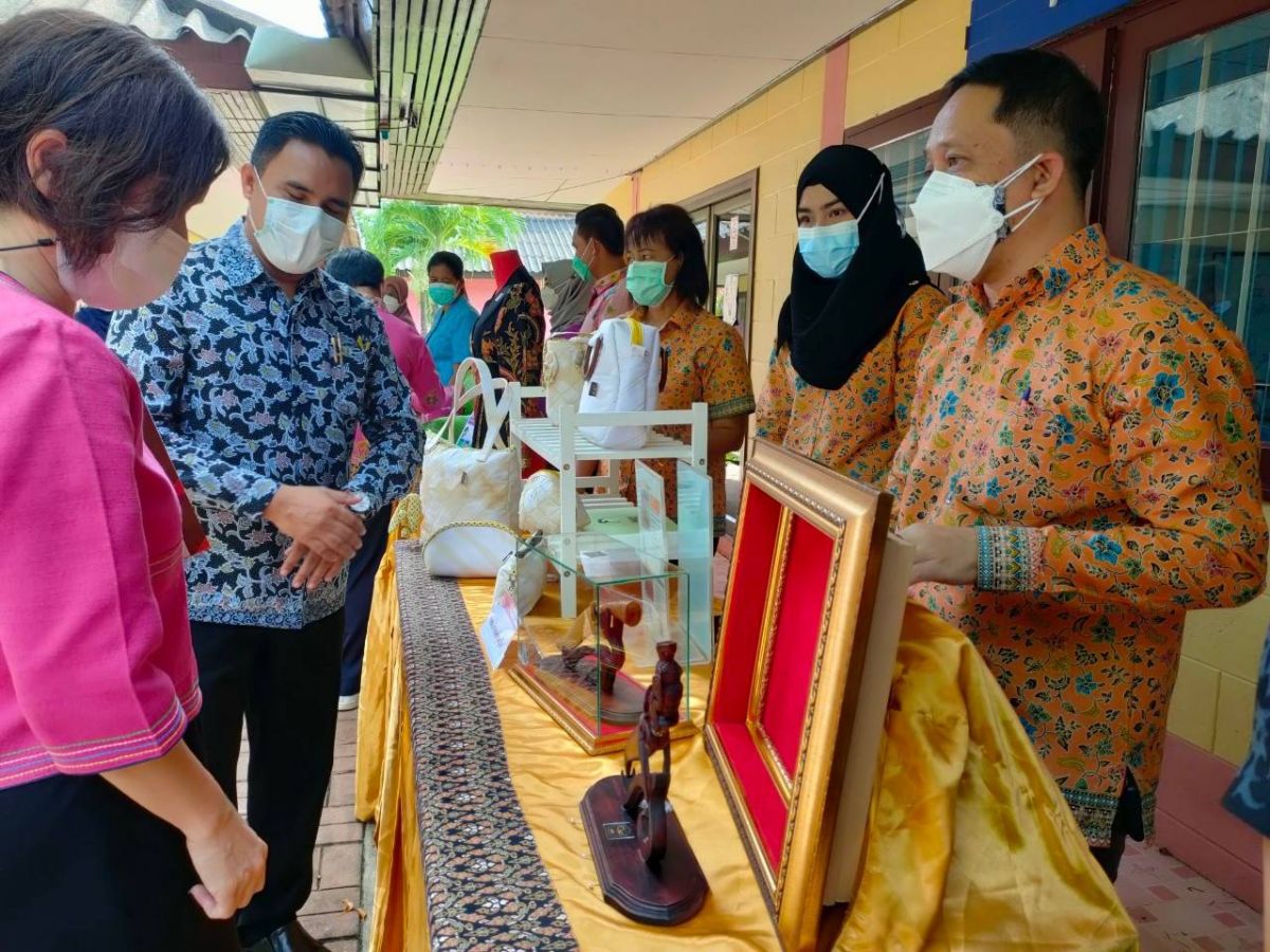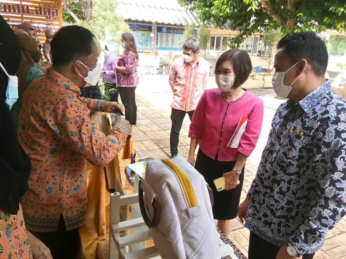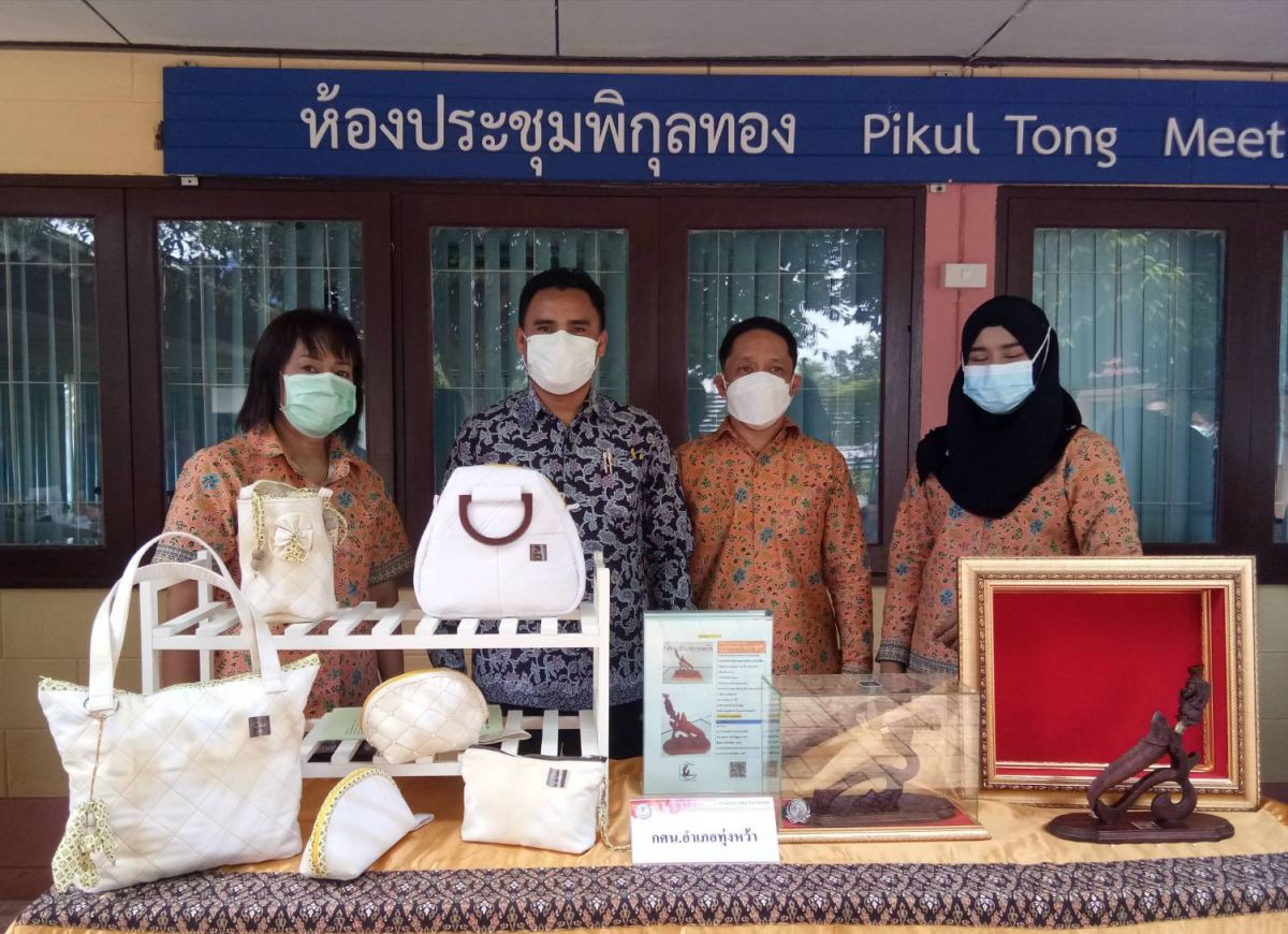 นายอาดำ ลิงาลาห์ ผู้อำนวยการศูนย์ กศน.อำเภอทุ่งหว้า จังหวัดสตูล พร้อมด้วยคณะทีมงานให้ข้อมูลคณะกรรมการเยี่ยมชมและคัดเลือกผลิตภัณฑ์ดีเด่น/ผลิตภัณฑ์พรีเมื่ยม ระดับจังหวัด ประจำปี 2565