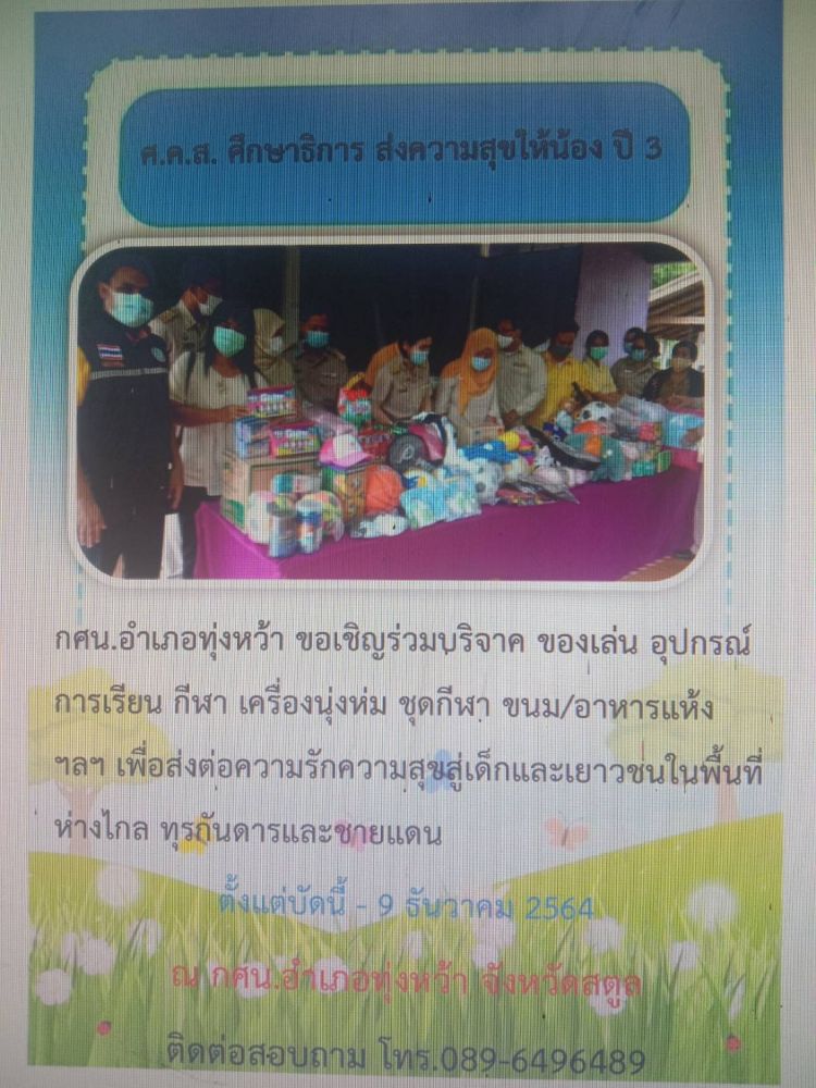 นายอาดำ ลิงาลาห์ ผู้อำนวยการศูนย์ กศน.อำเภอทุ่งหว้า จังหวัดสตูล มอบหมายให้นางสาวพัชรี ยอดราช ประชาสัมพันธ์กิจกรรม ศ.ค.ส. ศึกษาธิการส่งความสุขให้น้องปี 3 ขอเชิญร่วมบริจาคของเล่น อุปกรณ์การเรียน กีฬา เครื่องนุ่งหุ่ม ชุดกีฬา ขนม/อาหารแห้ง ฯลฯ เพื่อส่งต่อความรักความสุขสู่เด็กและเยาวชน ในพื้นที่ห่างไกล ทุรกันดารและชายแดน