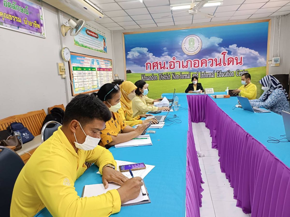 นางเนาวรัตน์ ศรีหมั่น ครูชำนาญการ รักษาการในตำแหน่ง ผู้อำนวยการ กศน.อำเภอควนโดน จังหวัดสตูล เป็นประธานและดำเนินการประชุม บุคลากรในสังกัด เพื่อวางแผนการดำเนินงาน และติดตามผลการดำเนินงาน และรับทราบนโยบายที่สำคัญของรัฐบาล และหารือข้อราชการที่สำคัญของสำนักงาน กศน. ณ ห้องประชุม กศน.อำเภอควนโดน จังหวัดสตูล