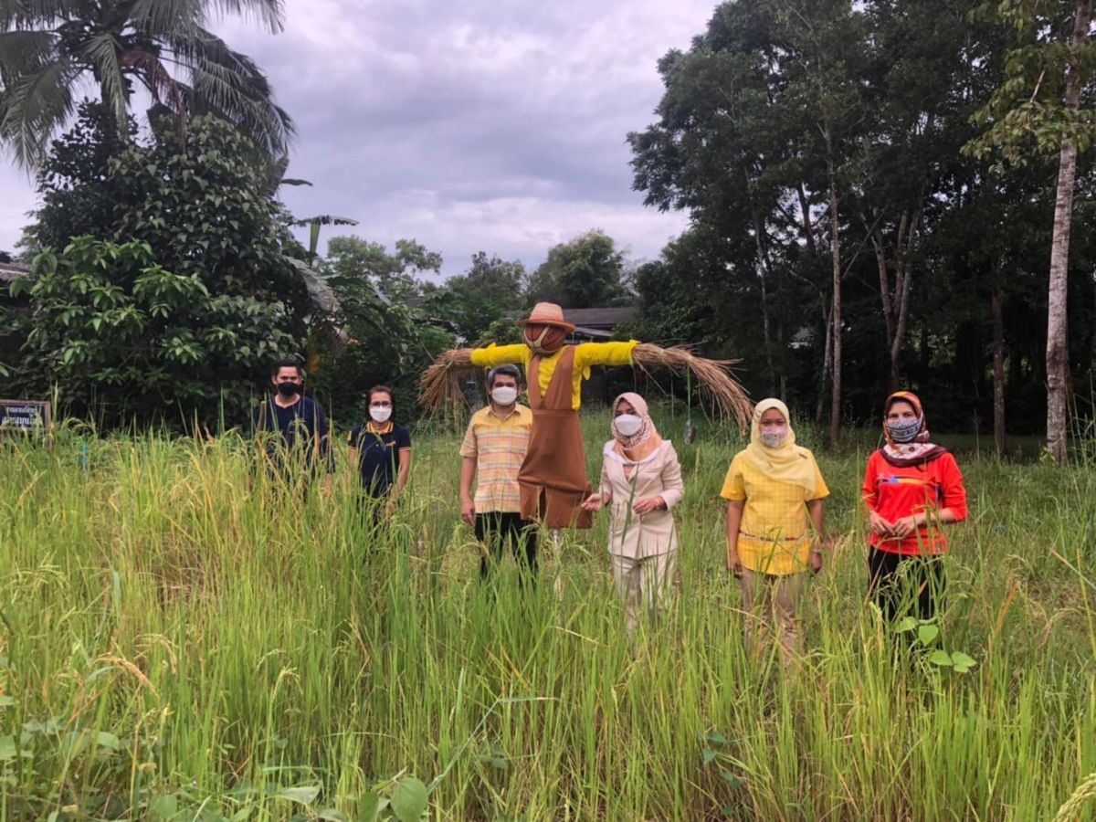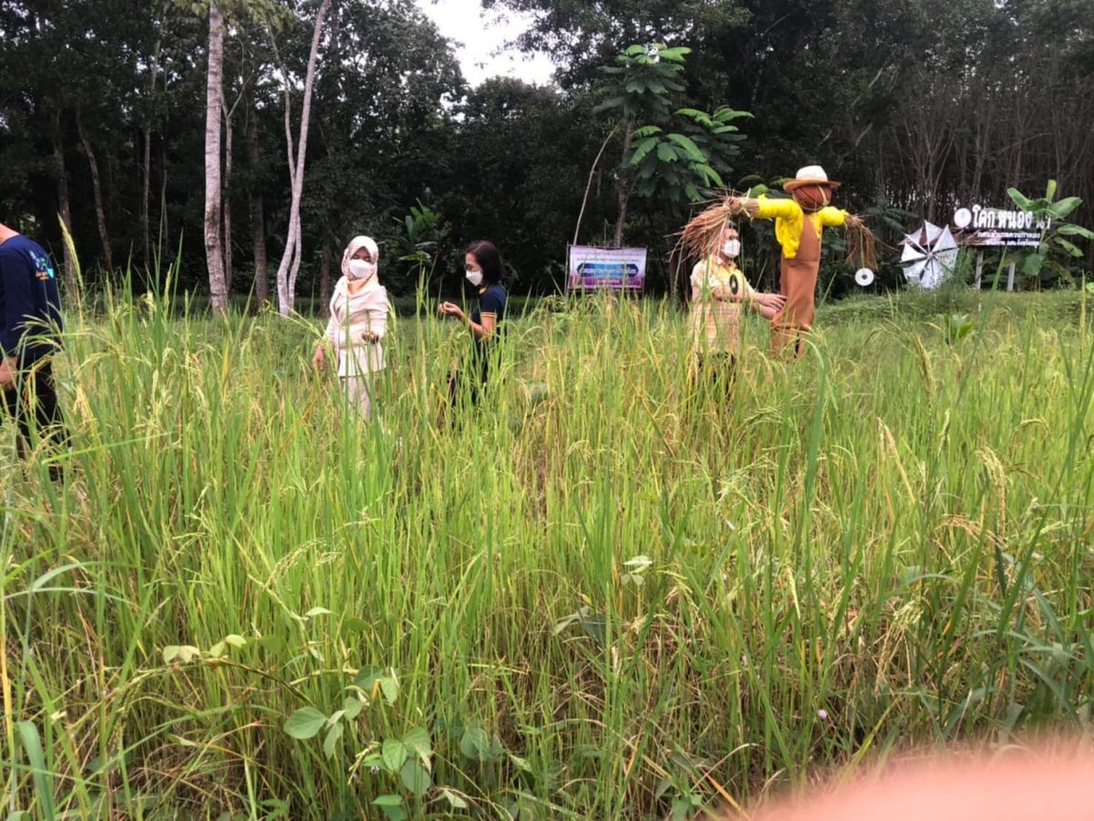 พร้อมด้วยบุคลากรในสังกัดร่วมกันดูแลแปลงนาข้าวและทำหุ่นไล่กาและพัฒนาแหล่งเรียนรู้