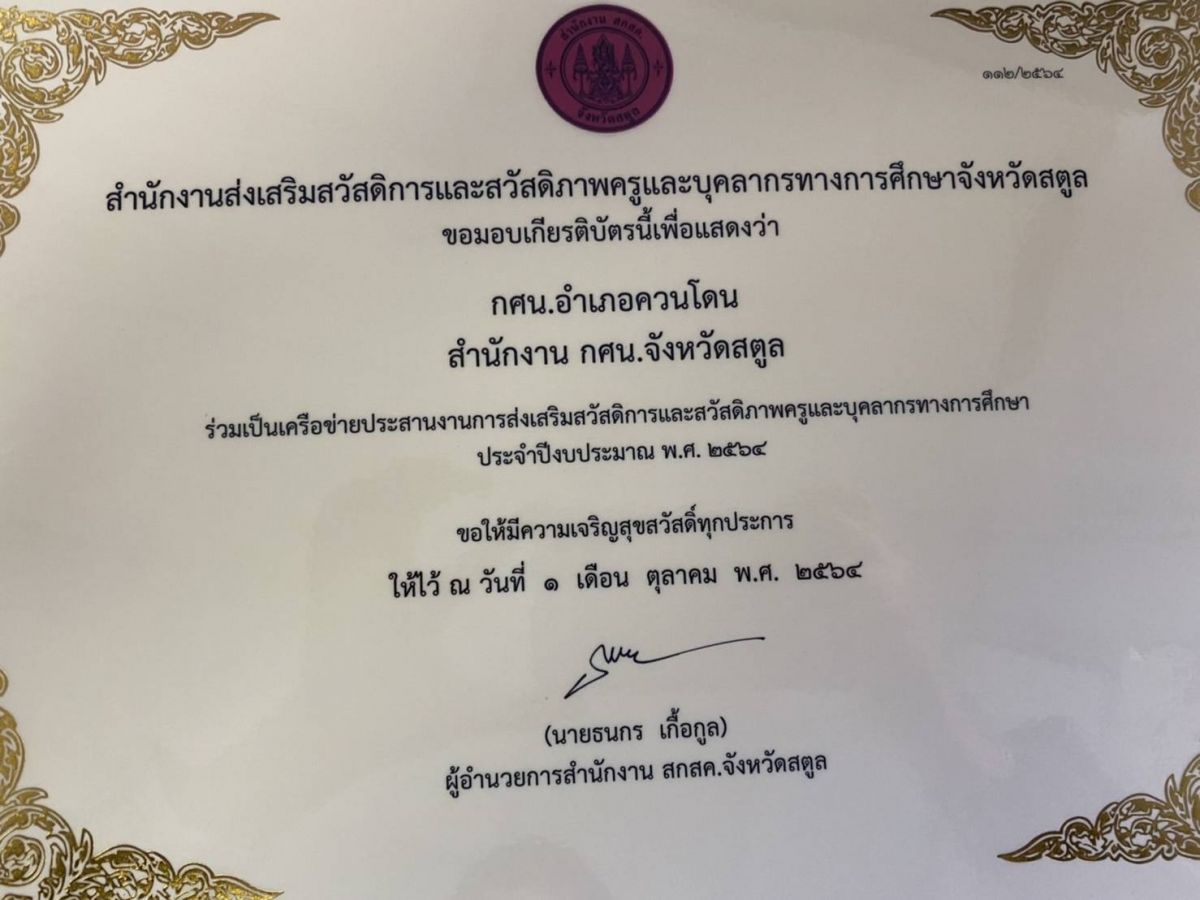 นางเนาวรัตน์ ศรีหมั่น ครูชำนาญการ รักษาการในตำแหน่ง ผู้อำนวยการ กศน.อำเภอควนโดน เข้ารับเกียรติบัตร ของสำนักงาน สกสค.จังหวัดสตูล ซึ่งให้กับสถานศึกษาในสังกัด สำนักงาน กศน.จังหวัดสตูล เพื่อแสดงว่า กศน.อำเภอควนโดน ร่วมเป็นเครือข่ายประสานงานการส่งเสริมสวัสดิการและสวัสดิภาพครูและบุคลากรทางการศึกษา โดยมีนายคณาธิป บุญญารัตน์ รองผู้อำนวยการ สำนักงาน กศน.จังหวัดสตูล เป็นผู้มอบเกียรติบัตร ณ ห้องพญากาหลง สำนักงาน กศน.จังหวัดสตูล
