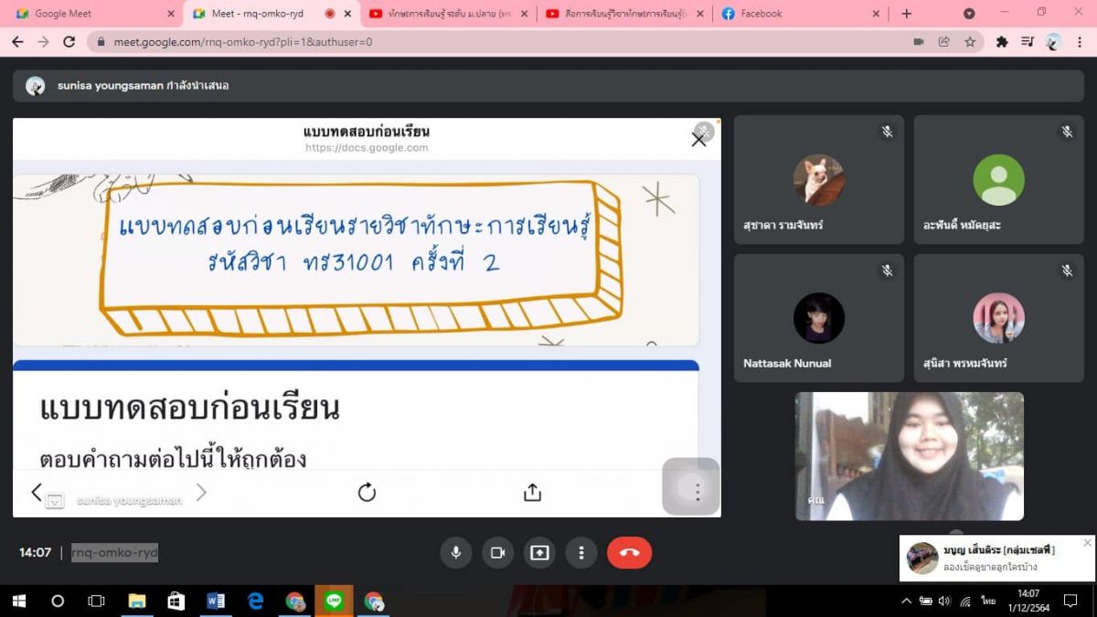 1 ธันวาคม 2564 นางสาววิภานันท์ พุทธนุกูล ผู้อำนวยการศูนย์ กศน.อำเภอเมืองสตูล มอบหมายให้ นางสาวสุนิษา ยังสมัน ครูอาสาสมัครฯกศน. ตำบลปูยู จัดกิจกรรมการเรียนการสอน กระบวนการเรียนรู้ออนไลน์ผ่าน google meet ให้กับนักศึกษาระดับมัธยมศึกษาตอนปลาย ประจำภาคเรียนที่ 2 ปีการศึกษา 2564 ภายใต้การควบคุมการแพร่ระบาดเชื้อไวรัสโคโรนา 2019