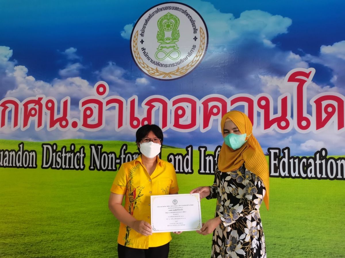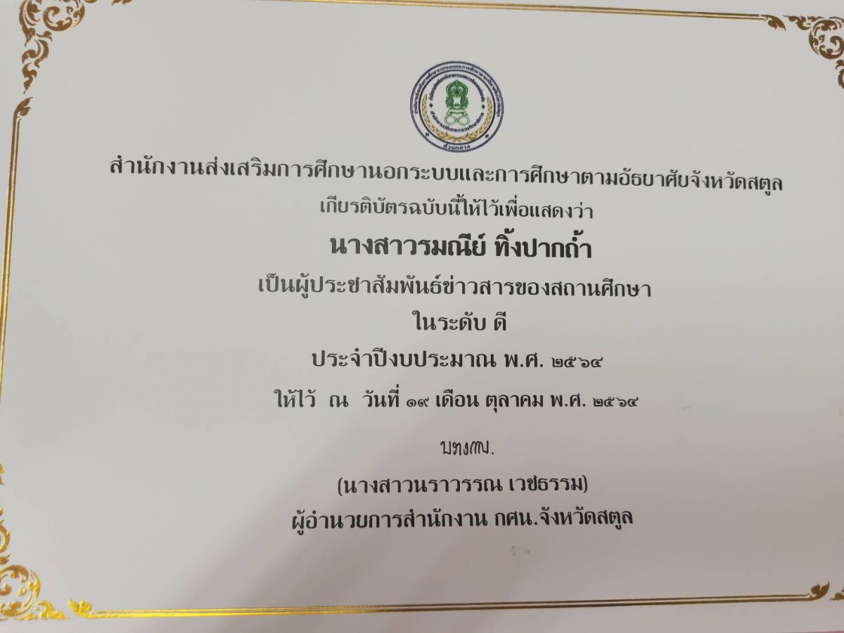 นางสาวรมณีย์ ทิ้งปากถ้ำ ครูอาสาสมัคร กศน.ตำบลย่านซื่อ เข้ารับเกียรติบัตร ของสำนักงาน กศน. จังหวัดสตูล ซึ่งมอบให้ผู้ประชาสัมพันธ์ข่าวสารของสถานศึกษาในสังกัด สำนักงาน กศน.จังหวัดสตูล เพื่อแสดงว่า นางสาวรมณีย์ ทิ้งปากถ้ำ ครูอาสาสมัคร กศน.ตำบลย่านซื่อ เป็นผู้ประชาสัมพันธ์ข่าวสารของสถานศึกษา ในระดับดี ประจำปีงบประมาณ พ.ศ.2564 เพื่อเป็นขวัญและกำลังใจในการปฏิบัติหน้าที่ต่อไป น็นปัโดยมีนางเนาวรัตน์ ศรีหมั่น ครูชำนาญการ รักษาการในตำแหน่ง ผู้อำนวยการ กศน.อำเภอควนโดน เป็นผู้มอบเกียรติบัตร ณ ห้องประชุม กศน.อำเภอควนโดน จังหวัดสตูล