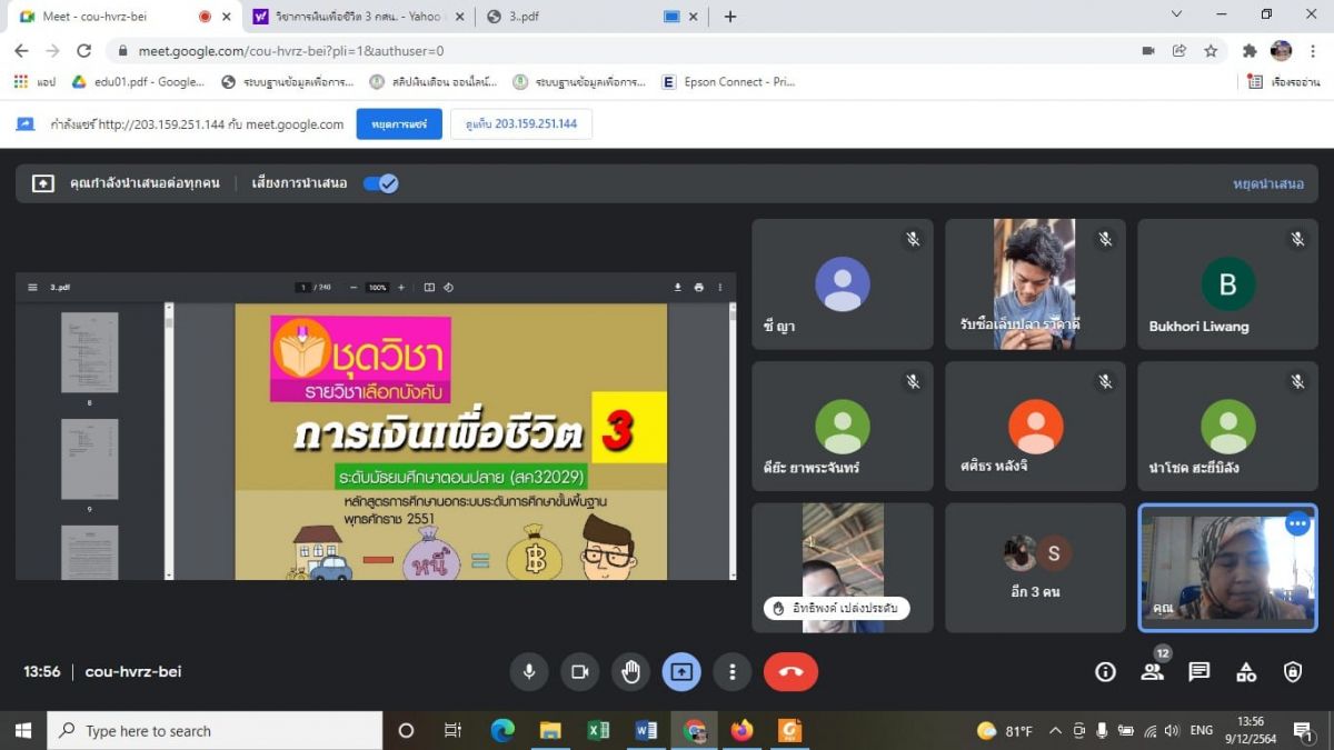 9 ธันวาคม 2564 นางสาววิภานันท์ พุทธนุกูล ผู้อำนวยการศูนย์ กศน.อำเภอเมืองสตูล มอบหมายให้ ครู กศน.ตำบลเจ๊ะบิลัง จัดกิจกรรมการเรียนการสอน กระบวนการเรียนรู้ออนไลน์ผ่าน google meet ให้กับนักศึกษาระดับมัธยมศึกษาตอนปลาย ประจำภาคเรียนที่ 2 ปีการศึกษา 2564 ภายใต้การควบคุมการแพร่ระบาดเชื้อไวรัสโคโรนา 2019