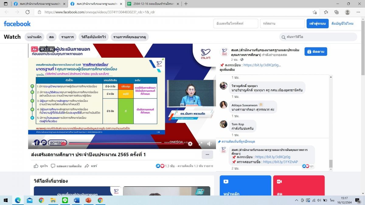 16 ธันวาคม 2564 นางสาววิภานันท์ พุทธนุกูล ผู้อำนวยการศูนย์ กศน.อำเภอเมืองสตูล มอบหมายให้ ครู กศน.และครูอาสาสมัคร กศน.ตำบลบ้านควน เข้าร่วมโครงการส่งเสริมสถานศึกษาและประสานความร่วมมือกับหน่วยงานต้นสังกัดเพื่อสร้างความรู้ความเข้าใจเกี่ยวกับ กรอบแนวทาง รูปแบบ และวิธีการประกันคุณภาพภายนอกภายใต้สถานการณ์จำเป็นและเร่งด่วนเนื่องจากการแพร่ระบาดของโรคติดเชื้อไวรัสโคโรนา covid-19 ประจำปีงบประมาณ 2565 ในหัวข้อ " แนวทางการประกันคุณภาพ ภายนอกภายใต้ สถานการณ์ covid 19" ผ่านทาง facebook Live ณ กศนตำบลบ้านควน อำเภอเมืองสตูลจังหวัดสตูล วิทยากรโดย ดร.นันทา หงวนตัด รักษาการผู้อำนวยการ สมศ.