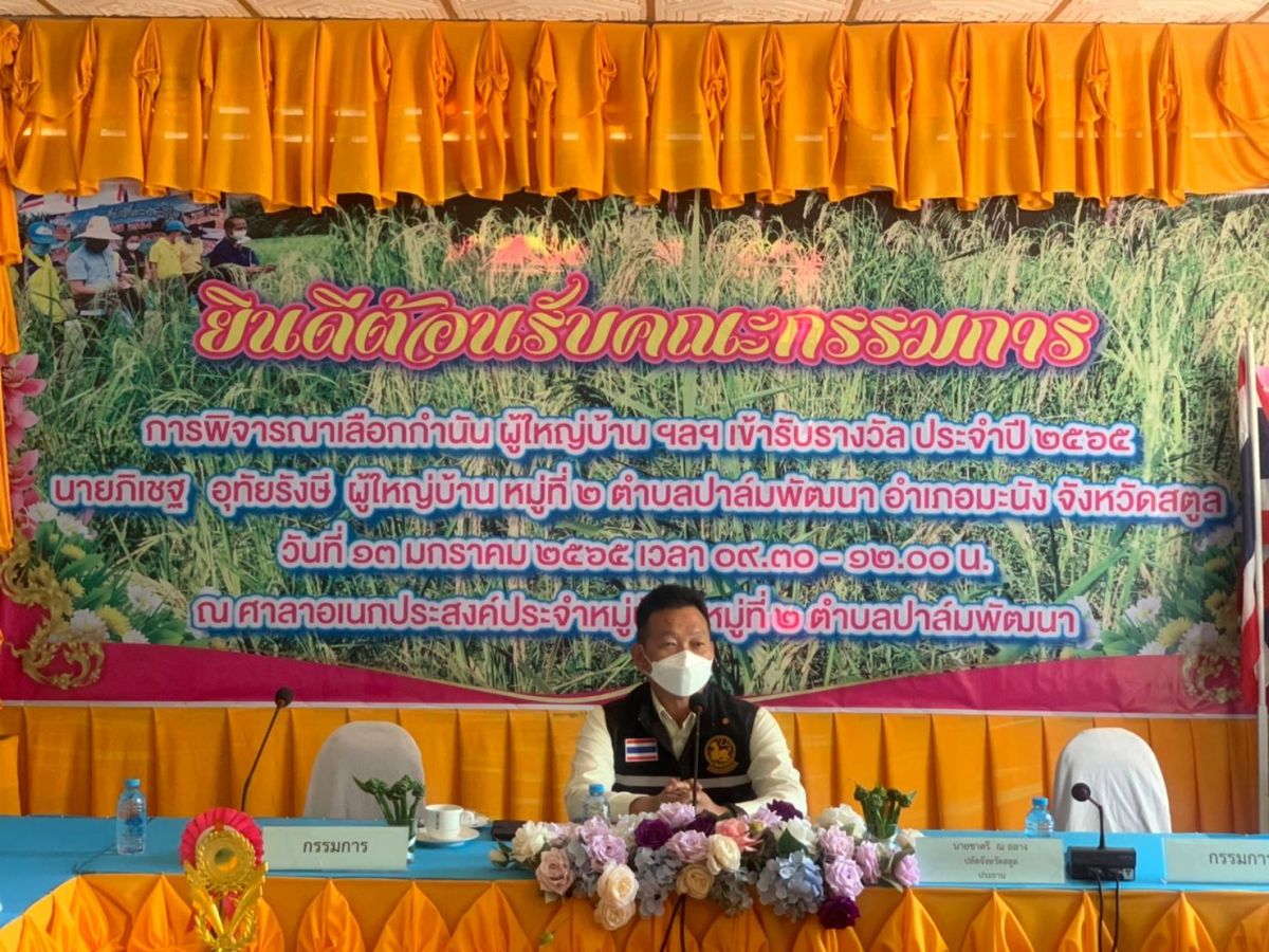 ผู้ใหญ่บ้าน ฯลฯ เข้ารับรางวัล ประจำปี 2565 ที่มีผลการปฏิบัติหน้าที่ดีเด่น ได้เสนอชื่อนายภิเชฐ อุทัยรังษี ผู้ใหญ่บ้าน หมู่ที่ 2 ตำบลปาล์มพัฒนา ในการนี้อยู่ในมาตรการป้องกันการแพร่ระบาดของเชื้อไวรัสโควิด -19 ณ ศาลาเอกประสงค์ประจำหมู่บ้าน หมู่ที่ 2 ตำบลปาล์มพัฒนา อำเภอมะนัง จังหวัดสตูล