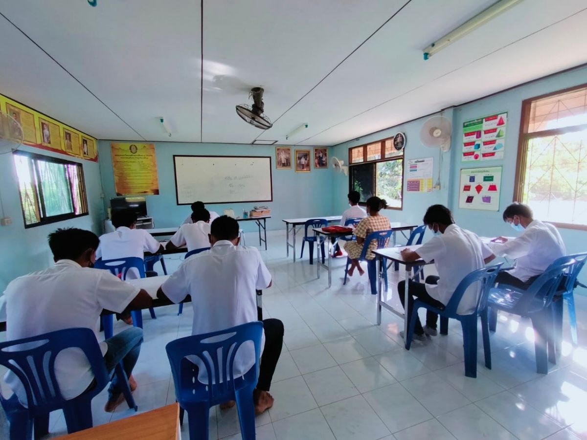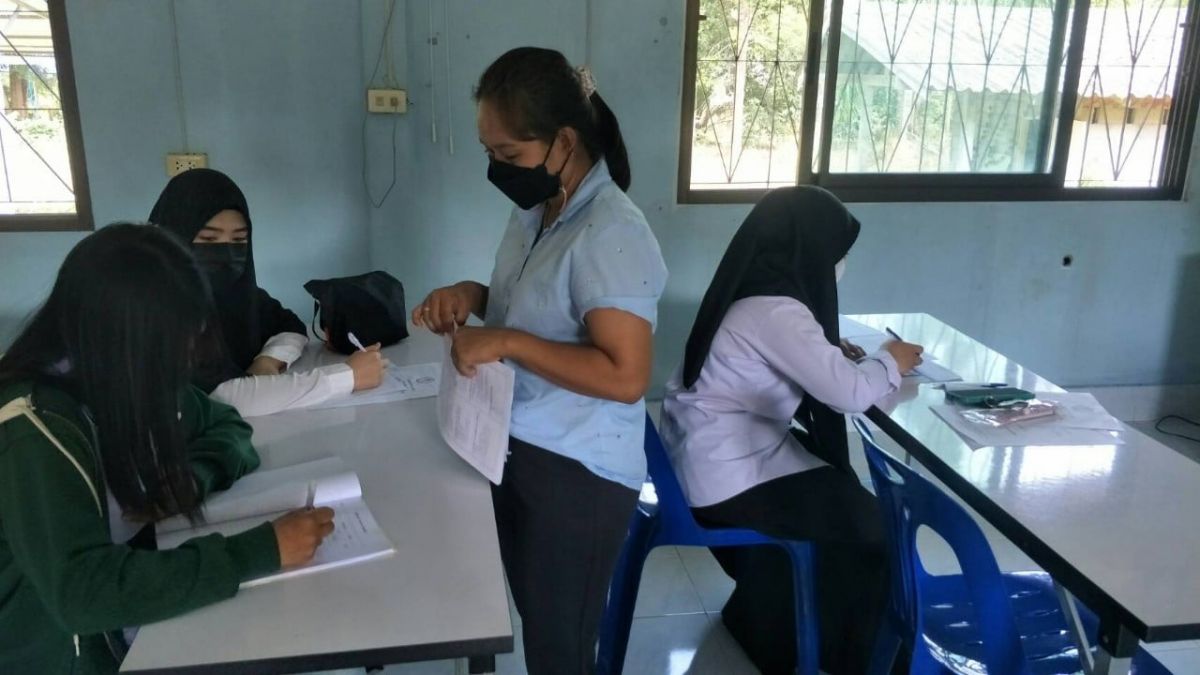 นางสาวจตุพร ทหารไทย ครูชำนาญการ รักษาการในตำแหน่ง ผู้อำนวยการศูนย์ กศน.อำเภอมะนัง จังหวัดสตูล มอบหมายให้นางสาวดวงกมล ประทุมมณี ครู กศน.ตำบลปาล์มพัฒนา ดำเนินการวัดและประเมินผลสัมฤทธิ์ กลางภาคเรียนที่ 2 ปีการศึกษา 2564 ระดับชั้นมัธยมตอนปลาย ในรูปแบบ On Site ในการนี้เป็นไปตามมาตรการป้องกันการแพร่ระบาดของเชื้อไวรัสโคโรน่า COVID -19 ณ กศน.ตำบลปาล์มพัฒนา อำเภอมะนัง จังหวัดสตูล