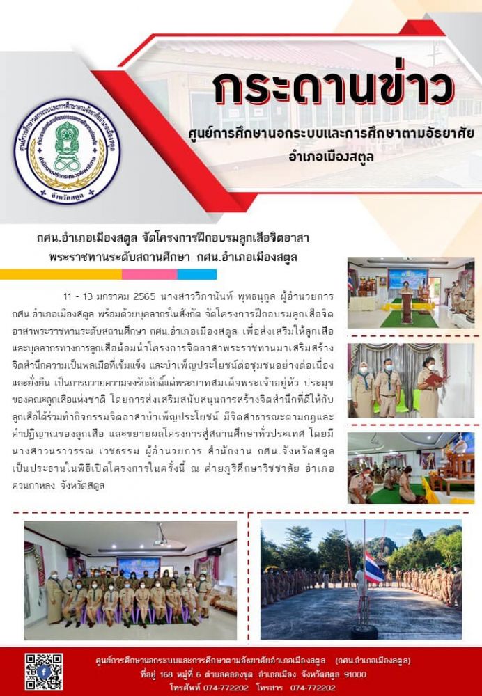 นางสาววิภานันท์ พุทธนุกูล ผู้อำนวยการ กศน.อำเภอเมืองสตูล พร้อมด้วยบุคลากรในสังกัด จัดโครงการฝึกอบรมลูกเสือจิตอาสาพระราชทานระดับสถานศึกษา กศน.อำเภอเมืองสตูล เพื่อส่งเสริมให้ลูกเสือและบุคลากรทางการลูกเสือน้อมนำโครงการจิตอาสาพระราชทานมาเสริมสร้างจิตสำนึกความเป็นพลเมือที่เข้มแข็ง และบำเพ็ญประโยชน์ต่อชุมชนอย่างต่อเนื่องและยั่งยืน เป็นการถวายความจงรักภักดิ์แด่พระบาทสมเด็จพระเจ้าอยู่หัว ประมุขของคณะลูกเสือแห่งชาติ โดยการส่งเสริมสนับสนุนการสร้างจิตสำนึกที่ดีให้กับลูกเสือได้ร่วมทำกิจกรรมจิตอาสาบำเพ็ญประโยชน์ มีจิตสาธารณะตามกฎและคำปฏิญาณของลูกเสือ และขยายผลโครงการสู่สถานศึกษาทั่วประเทศ