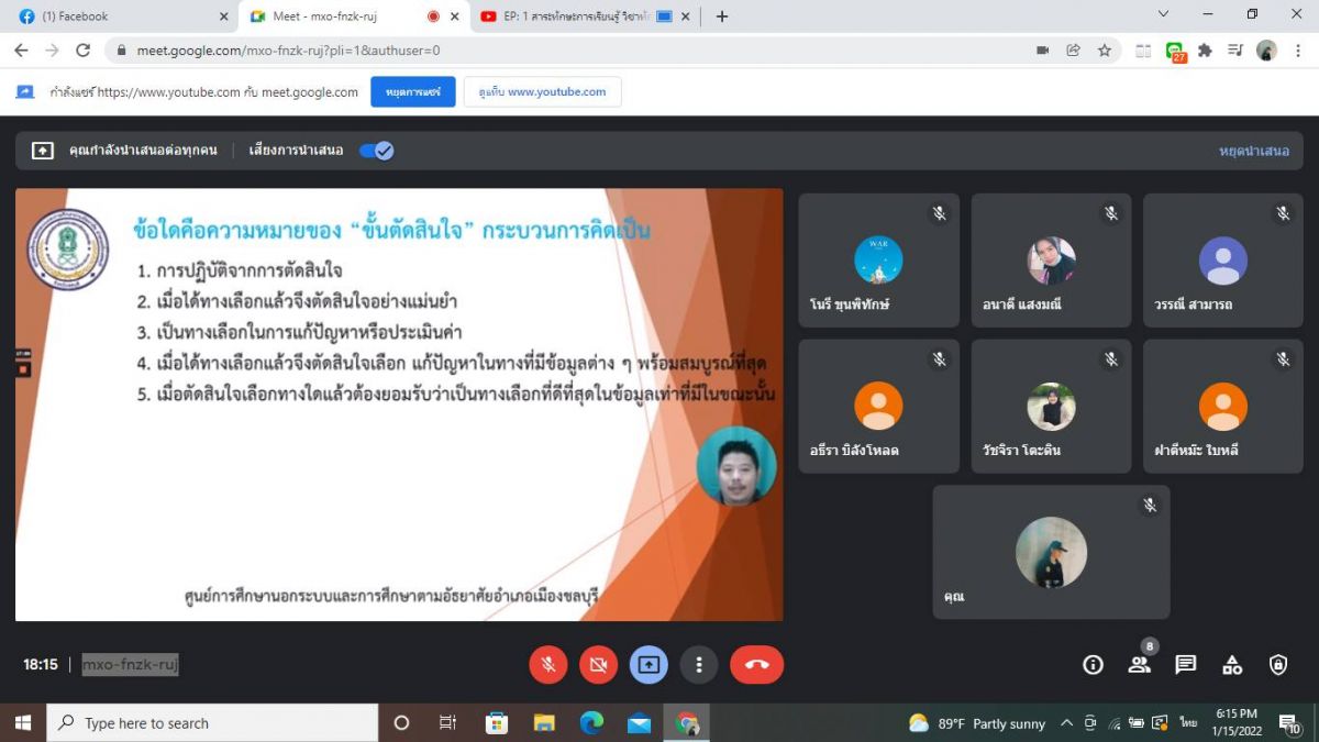15 มกราคม 2565 นางสาววิภานันท์ พุทธนุกูล ผู้อำนวยการศูนย์ กศน.อำเภอเมืองสตูล มอบหมายให้ นางสาวอภิญญา นกดำ ครู กศน.ตำบลปูยู จัดกิจกรรมการเรียนการสอน กระบวนการเรียนรู้ออนไลน์ผ่าน google meet ให้กับนักศึกษาระดับมัธยมศึกษาตอนปลาย ประจำภาคเรียนที่ 2 ปีการศึกษา 2564 ภายใต้การควบคุมการแพร่ระบาดเชื้อไวรัสโคโรนา 2019