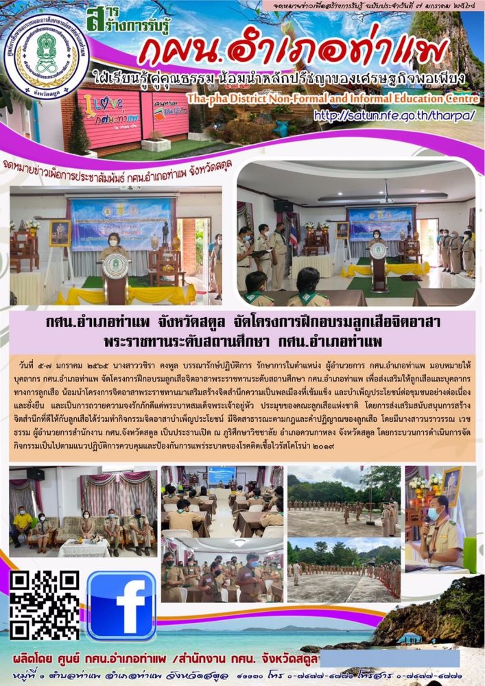 กศน.อำเภอท่าแพ สร้างสารการรับรู้ โครงการฝึกอบรมลูกเสือจิตอาสาพระราชทานระดับสถานศึกษา กศน.อำเภอท่าแพ ในระหว่างวันที่ 5-7มกราคม 2565
