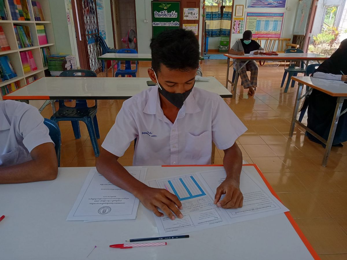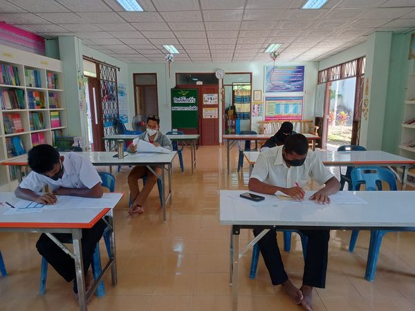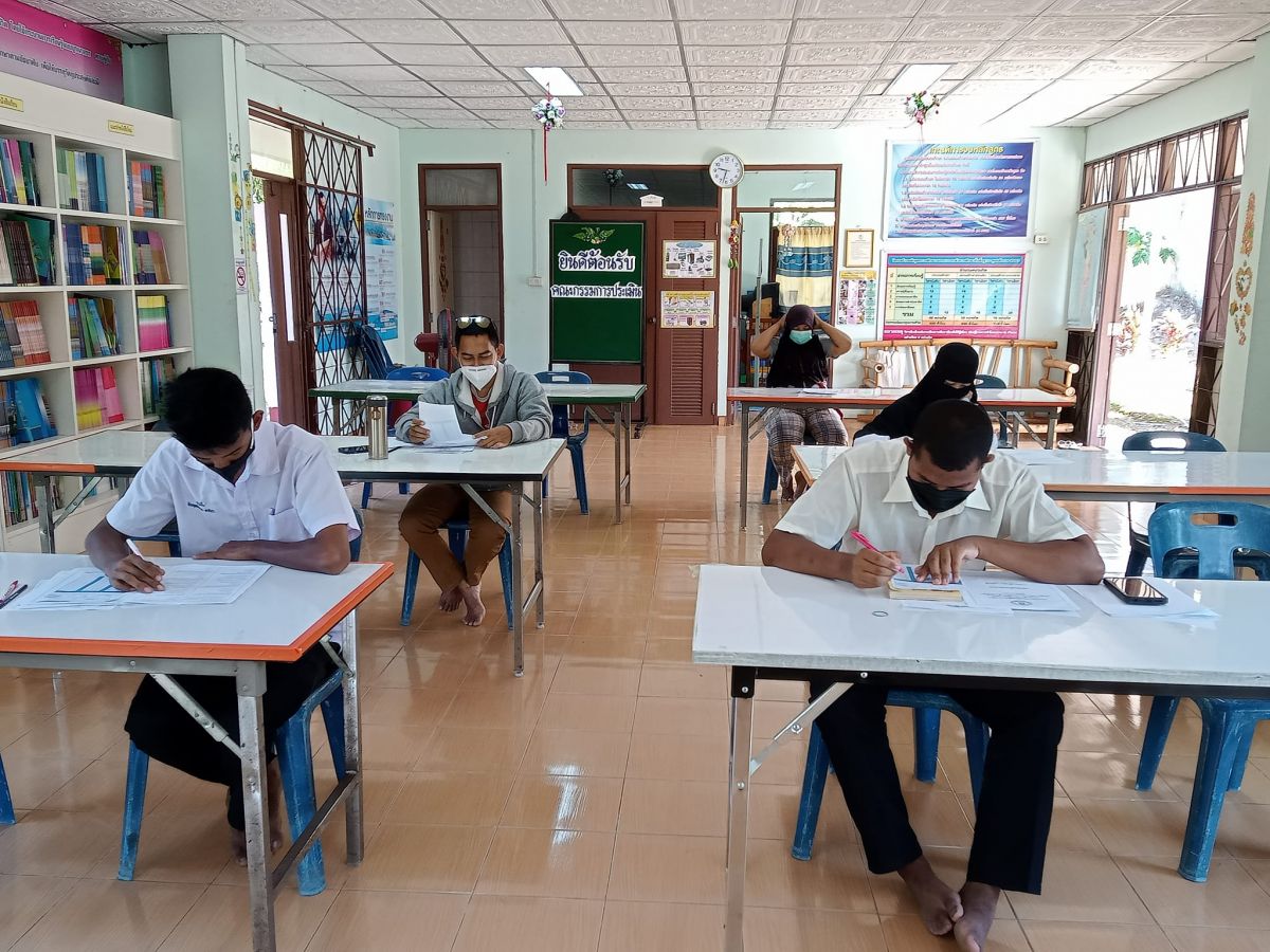 นางวนิดา รักเมือง ครู กศน.ตำบลวังประจัน ได้รับมอบหมายจากนางเนาวรัตน์ ศรีหมั่นครู ชำนาญการ รักษาการในตำแหน่ง ผอ.กศน.อำเภอควนโดน ดำเนินการจัดสอบกลางภาคเรียนให้กับนักศึกษาระดับม.ปลาย ประจำภาคเรียนที่ 2 ปีการศึกษา 2564 ภายใต้การควบคุมการแพร่ระบาดเชื้อไวรัสโคโรนา 2019 ณ กศน.ตำบลวังประจัน อำเภอควนโดน จังหวัดสตูล