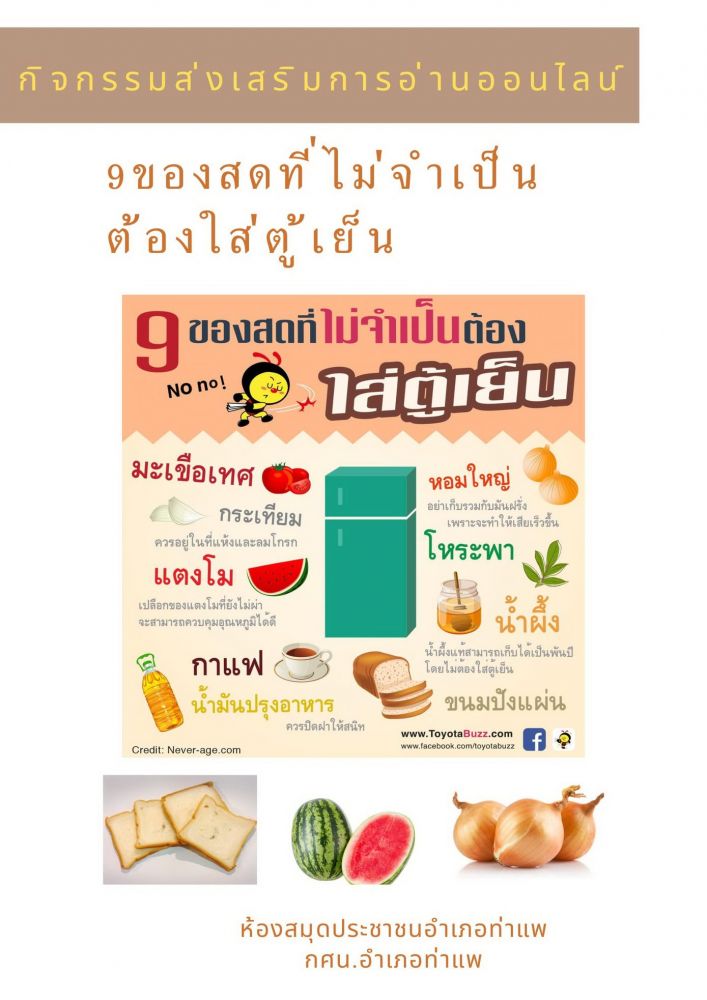 "9 ของสดที่ไม่จำเป็นต้องใส่ตู้เย็น" เพื่อส่งเสริมการอ่านให้กับผู้รับบริการได้มีความรู้และนำไปปรับใช้ในชีวิตประจำวัน