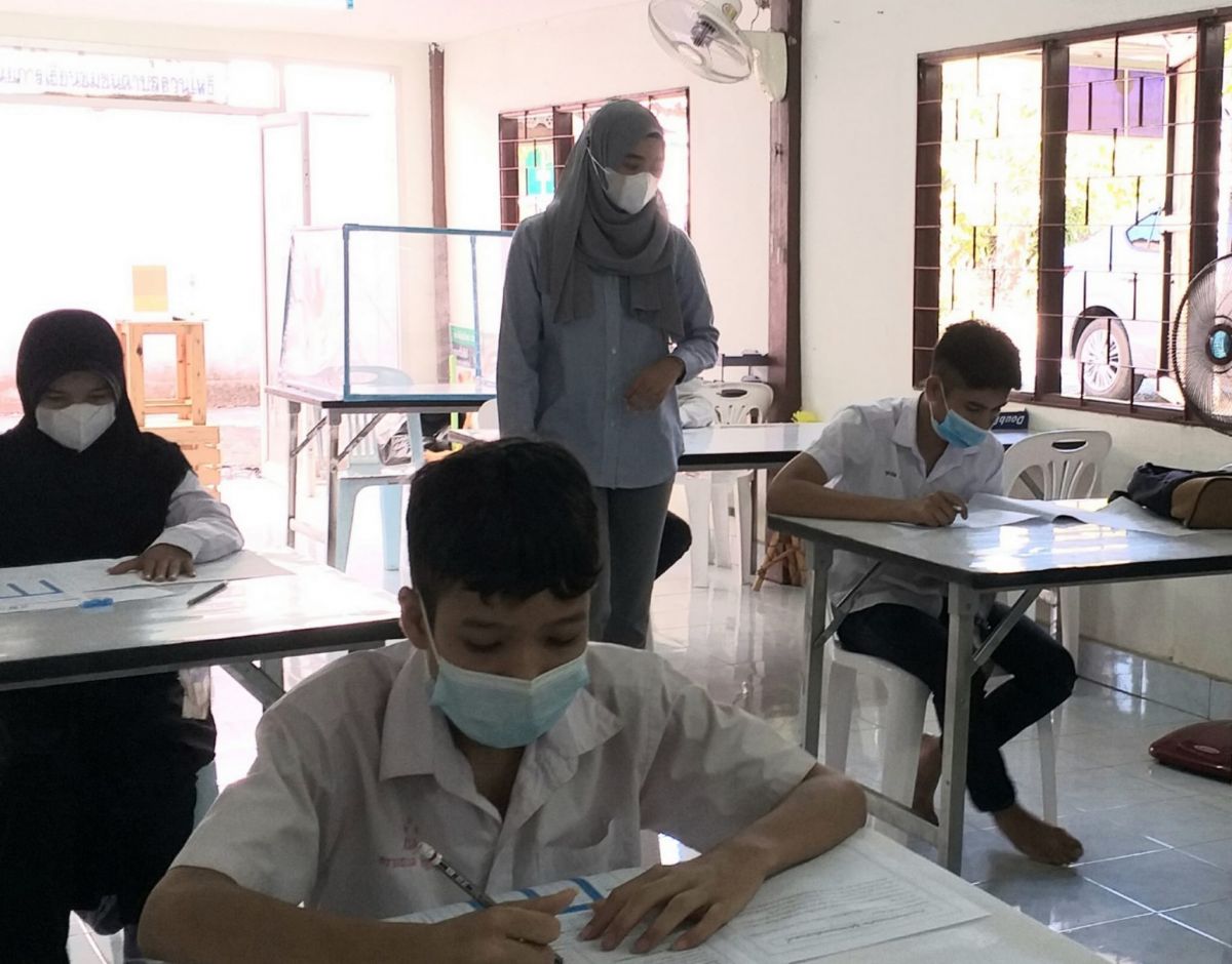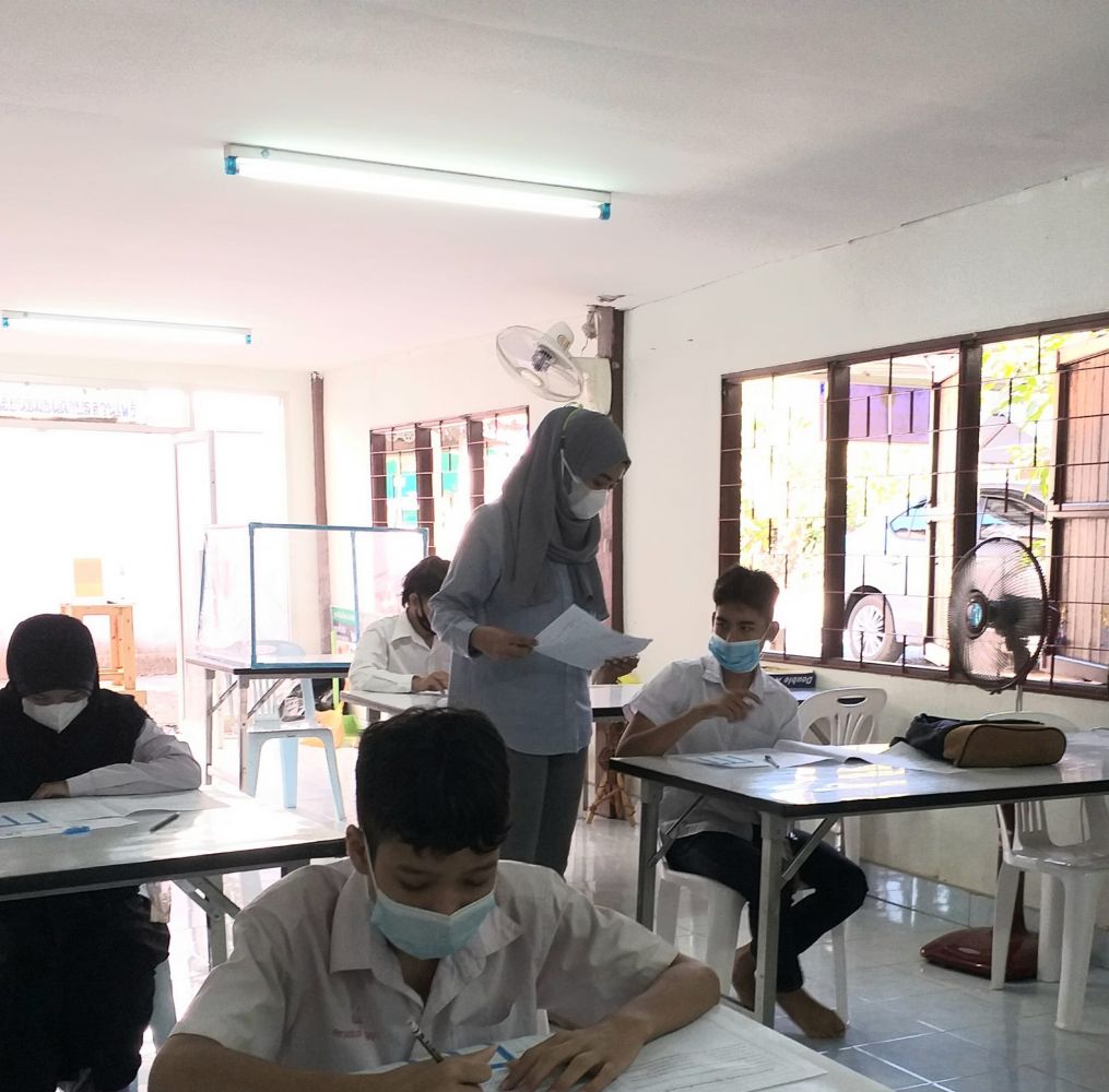นางสาววิภานันท์ พุทธนุกูล ผู้อำนวยการศูนย์ กศน.อำเภอเมืองสตูล มอบหมายให้ ครูกศน.ตำบลดำเนินการจัดสอบกลางภาคเรียนให้กับนักศึกษาระดับมัธยมศึกษาตอนปลาย ประจำภาคเรียนที่ 2 ปีการศึกษา 2564 ภายใต้การควบคุมการแพร่ระบาดเชื้อไวรัสโคโรนา 2019 ณ กศน.ตำบลควนโพธิ์ อำเภอเมือง จังหวัดสตูล