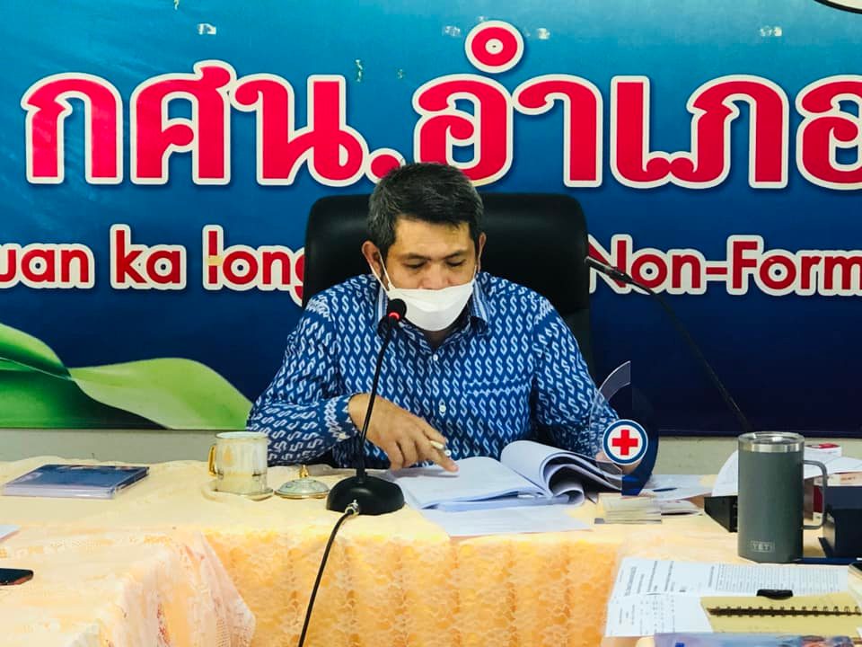 นายทวีศักดิ์ แซ่เจน ครูชำนาญการ รักษาการในตำแหน่งผู้อำนวยการศูนย์ กศน.อำเภอควนกาหลง ประชุมบุคลากรเพื่อติดตามการดำเนินงานกศน.ให้เป็นไปในทิศทางเดียวกันโดยกระบวนการดำเนินการจัดกิจกรรมเป็นไปตามแนวปฏิบัติการควบคุมและป้องกันการแพร่ระบาดของโรคติดเชื้อไวรัสโคโรน่า 2019