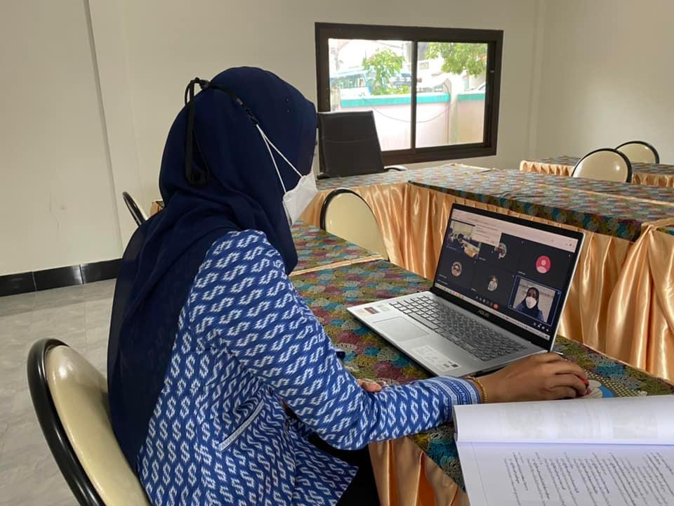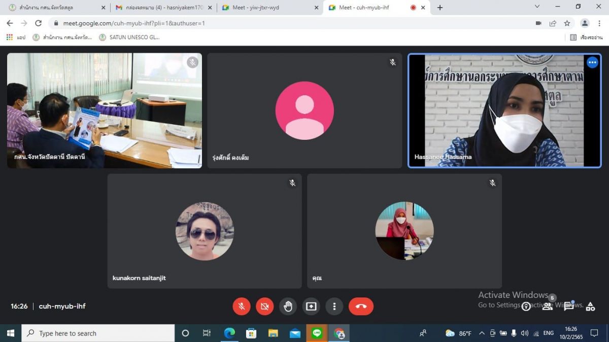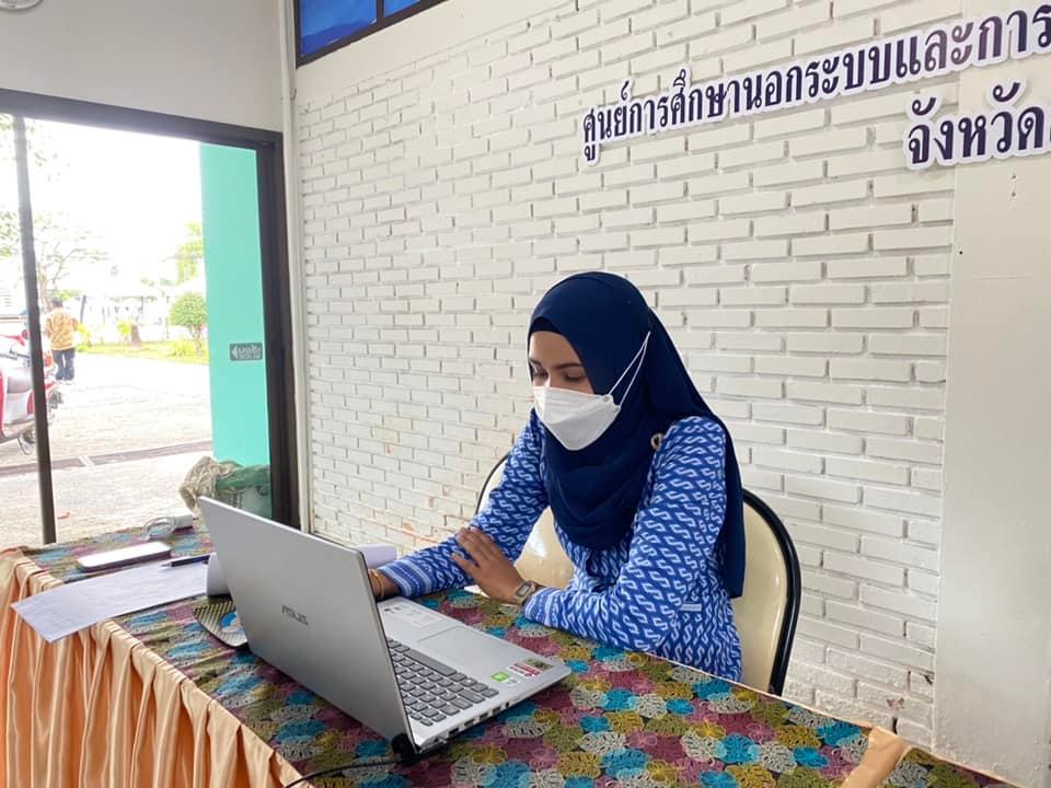 นางหัสนีย์ หัสมา ครูประจำศูนย์การเรียนชุมชน กศน.อำเภอละงู เข้าร่วมการคัดเลือกการปฏิบัติงาน กศน.ดีเด่น ระดับกลุ่มสำนักงาน กศน.จังหวัดชายแดนใต้ ประจำปี 2564 โดยรูปแบบออนไลน์ ผ่านระบบ Google meet