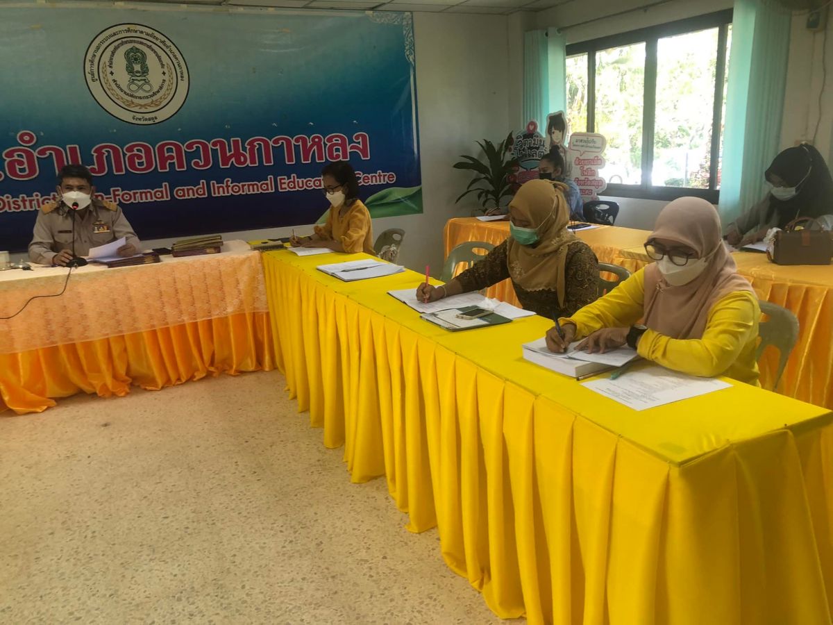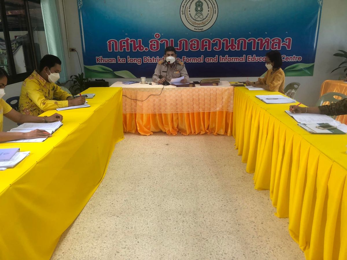 นายทวีศักดิ์ แซ่เจน ครูชำนาญการ รักษาการในตำแหน่งผู้อำนวยการศูนย์ กศน.อำเภอควนกาหลง ประชุมบุคลากรเพื่อติดตามการดำเนินงานกศน.ให้เป็นไปในทิศทางเดียวกันโดยกระบวนการดำเนินการจัดกิจกรรมเป็นไปตามแนวปฏิบัติการควบคุมและป้องกันการแพร่ระบาดของโรคติดเชื้อไวรัสโคโรน่า 2019 ณ กศน.อำเภอควนกาหลง จังหวัด สตูล