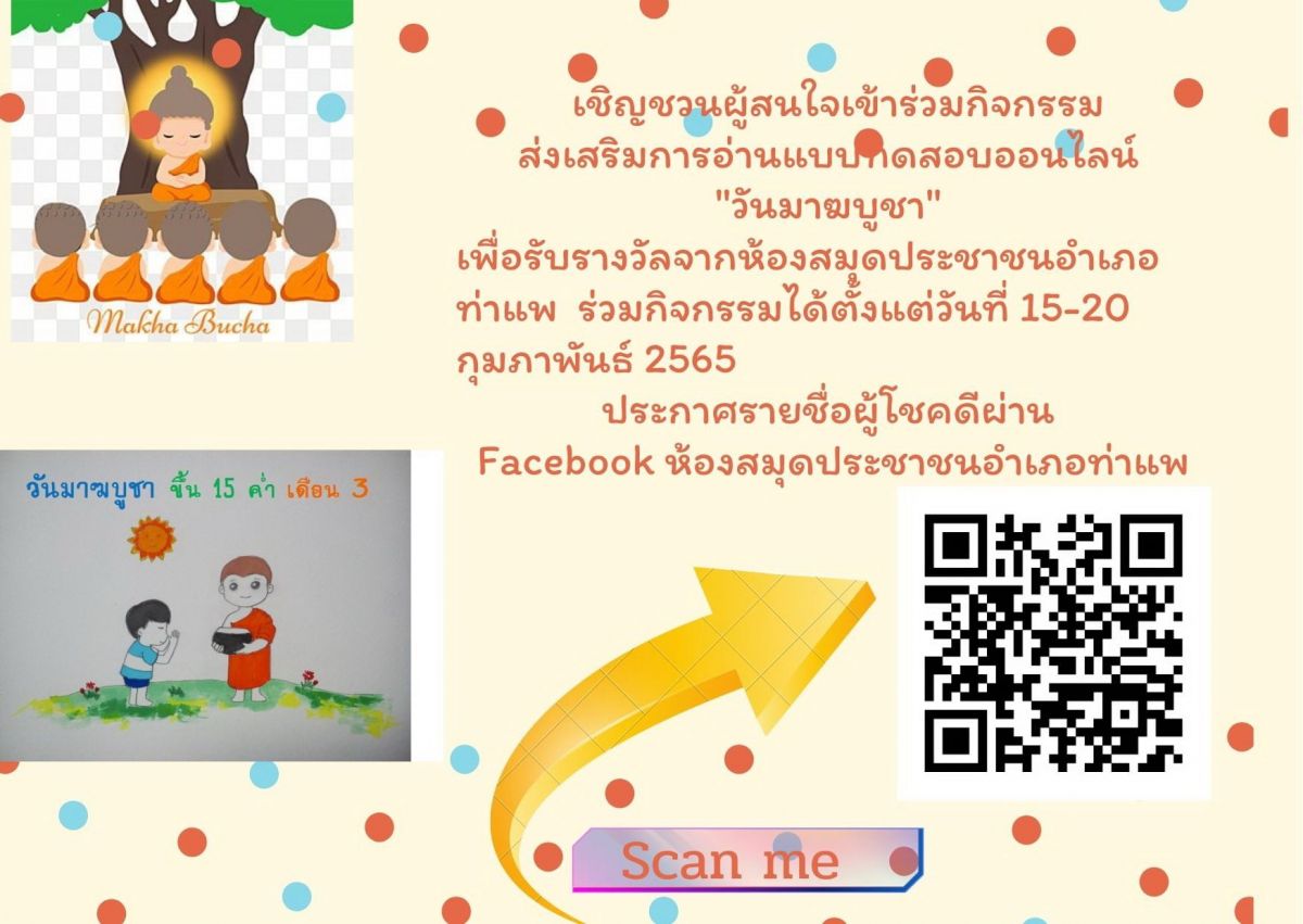 ห้องสมุดประชาชนอำเภอท่าแพ ขอเชิญร่วมกิจกรรมส่งเสริมการอ่านผ่านสื่อออนไลน์ เนื่องในวันสำคัญ ร่วมทำแบบทดสอบออนไลน์ "วันมาฆบูชา" โดยสแกนคิวอาร์โค้ดตอบคำถาม