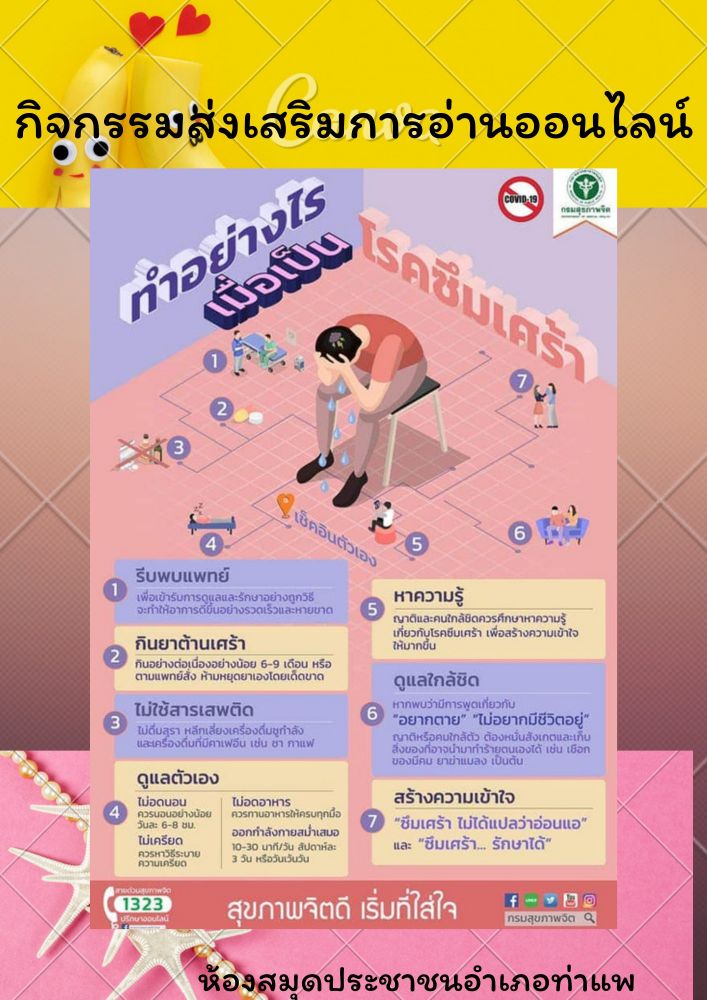 วันที่ 24 กุมภาพันธ์ 2565 นางสาววชิรา คงพูล บรรณารักษ์ ห้องสมุดประชาชนอำเภอท่าแพ จัดกิจกรรมส่งเสริมการอ่านออนไลน์📣📣 \" ทำอย่างไรเมื่อเป็นโรคซึมเศร้า\" เพื่อส่งเสริมการอ่านให้กับประชาชนได้เช็คอาการของตนเองและคนรอบข้าง