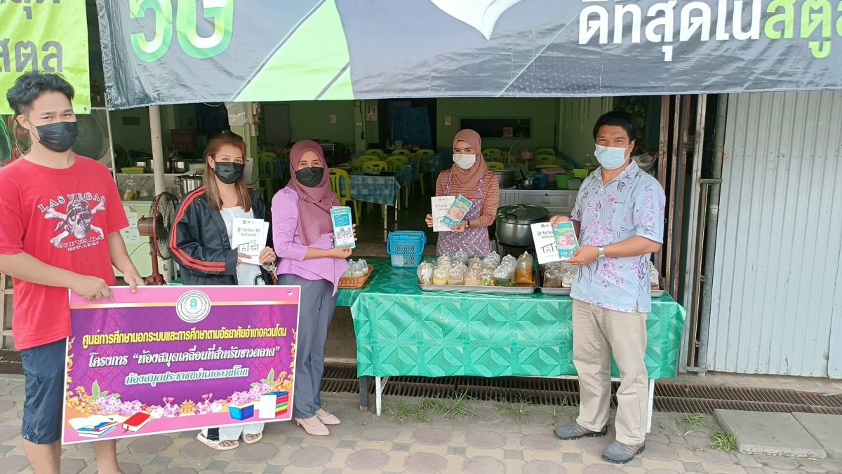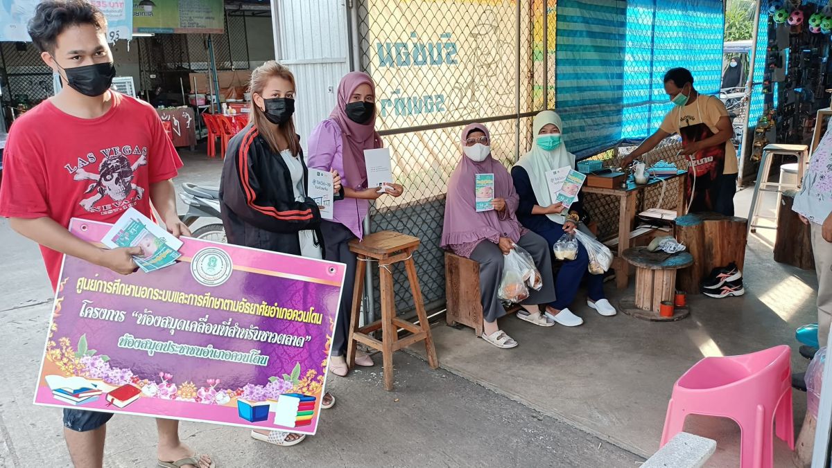 กศน.ตำบลควนโดน และอาสาสมัครส่งเสริมการอ่านจัดกิจกรรมส่งเสริมการอ่านห้องสมุดเคลื่อนที่สำหรับชาวตลาด