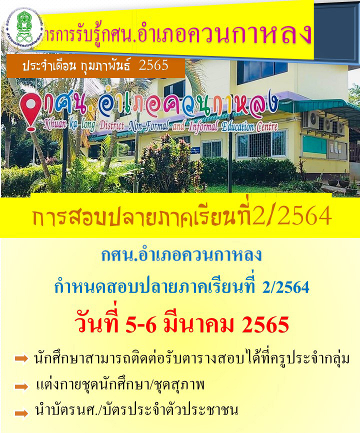 กศน.อำเภอควนกาหลง กำหนดสอบปลายภาคเรียนที่ 2/2564