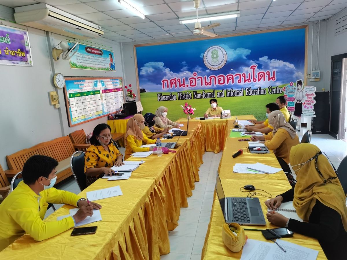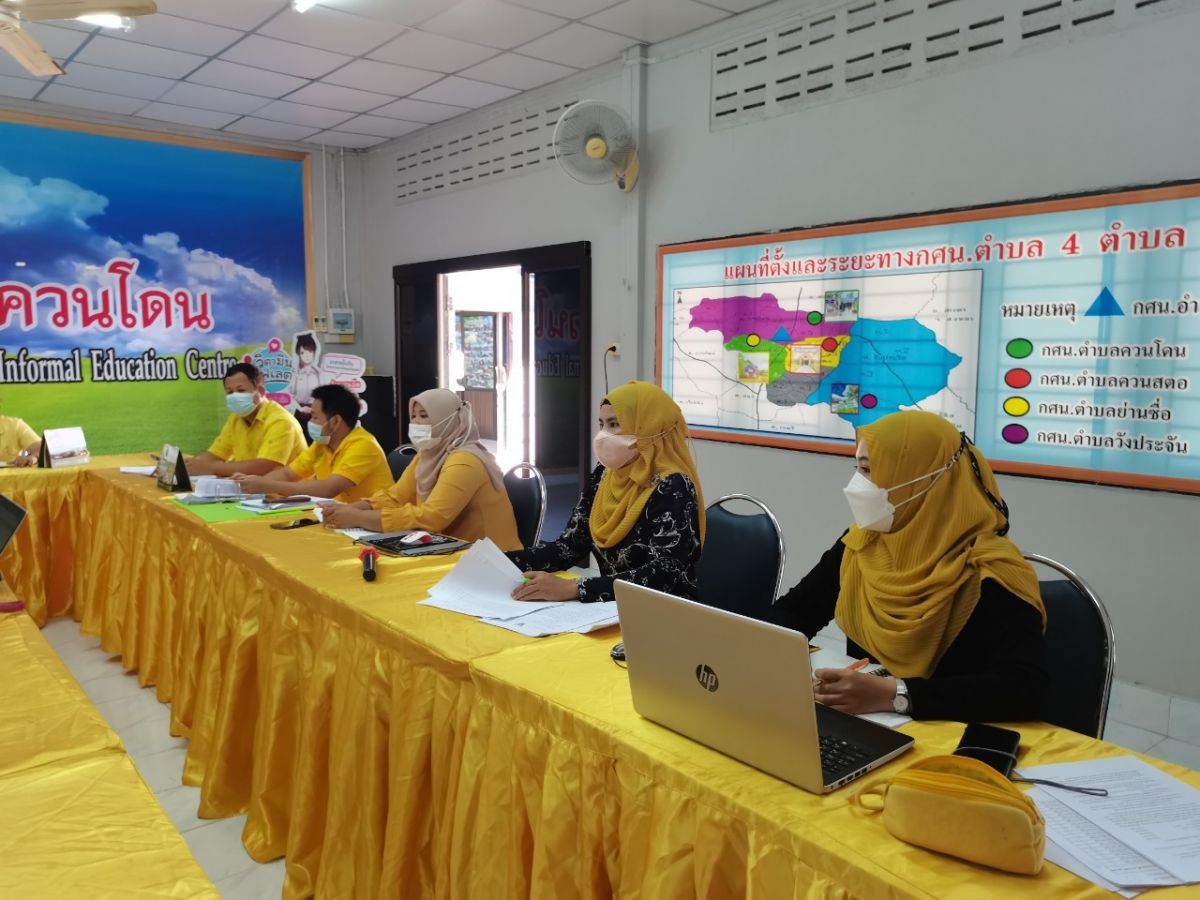 นางสาวนุรวาตี หมัดสกุล ครูกศน.ตำบลย่านซื่อ และนางสาวรมณีย์ ทิ้งปากถ้ำ ครูอาสาสมัครกศน.ตำบลย่านซื่อ พร้อมด้วยด้วยบุคลากร กศน.อำเภอควนโดน เข้าร่วมประชุมบุคลากรในสังกัดสถานศึกษาประจำสัปดาห์ เพื่อเตรียมความพร้อมก่อนการวัดผลและประเมินผลการสอบปลายภาคเรียนที่ 2 ปีการศึกษา 2564 ในการดำเนินการประชุมครั้งนี้เป็นไปตามมาตรการป้องกันการแพร่ระบาดของโรคติดเชื้อไวรัสโคโรนา 2019 อย่างเคร่งครัด ณ ห้องประชุม กศน.อำเภอควนโดน จังหวัดสตูล โดยมีนางเนาวรัตน์ ศรีหมั่น ครู ชำนาญการ รักษาการในตำแหน่ง ผู้อำนวยการ กศน.อำเภอควนโดน จังหวัดสตูล เป็นประธานและดำเนินการประชุม
