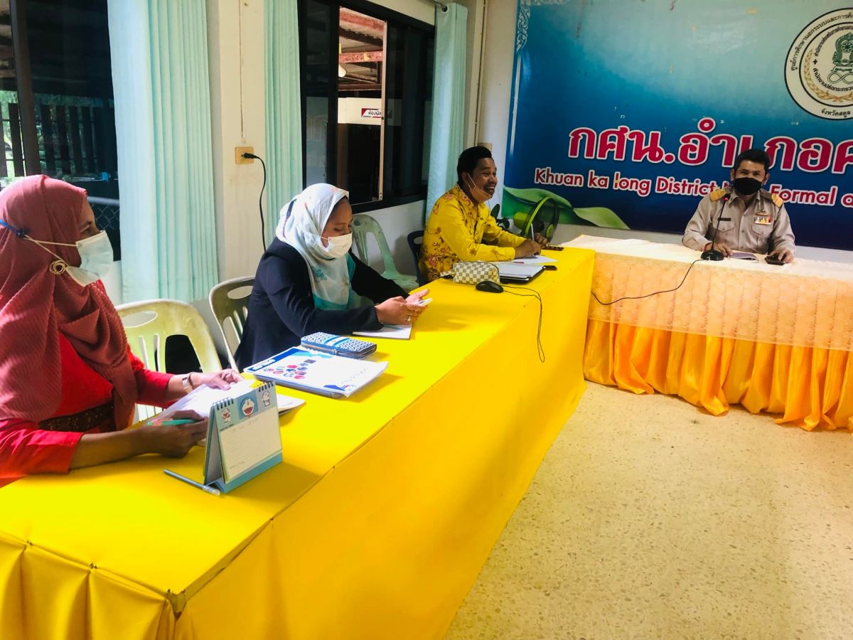 นายทวีศักดิ์ แซ่เจน ครูชำนาญการ รักษาการในตำแหน่งผู้อำนวยการศูนย์ กศน.อำเภอควนกาหลง ประชุมบุคลากรเพื่อติดตามการดำเนินงานกศน.ให้เป็นไปในทิศทางเดียวกันโดยกระบวนการดำเนินการจัดกิจกรรมเป็นไปตามแนวปฏิบัติการควบคุมและป้องกันการแพร่ระบาดของโรคติดเชื้อไวรัสโคโรน่า 2019