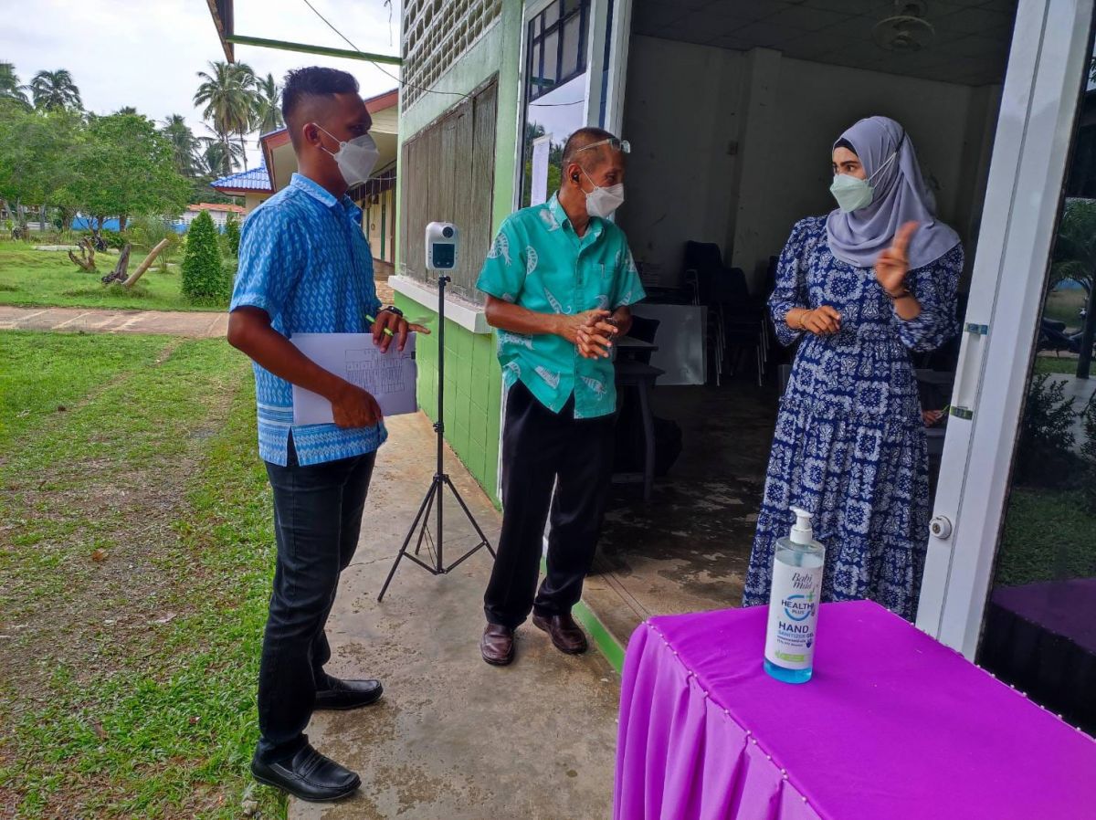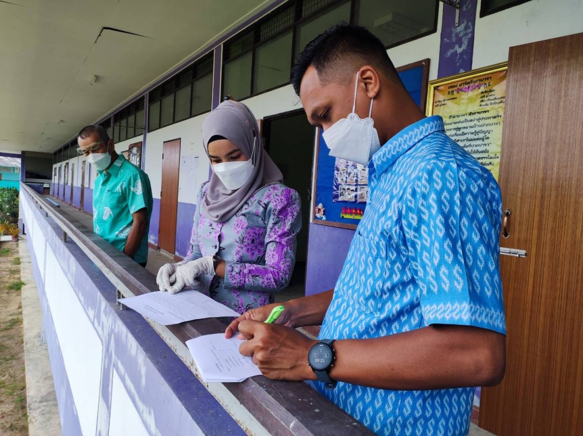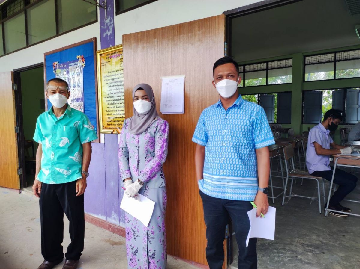 นายมรกตต กันหนองผือ ผู้อำนวยการ กศน.อำเภอละงู พร้อมบุคลากร ร่วมต้อนรับนายคณาธิป บุญญารัตน์ รองผู้อำนวยการสำนักงาน กศน.จังหวัดสตูล และเจ้าหน้าที่ที่เกี่ยวข้อง ในการนิเทศสนามสอบวัดผลสัมฤทธิ์ ปลายภาคเรียน หลักสูตรการศึกษานอกระบบ ระดับการศึกษาขั้นพื้นฐาน พุทธศักราช 2551 ประจำภาคเรียนที่ 2 ปีการศึกษา 2564 ทั้งนี้การดำเนินการสอบปฏิบัติตามมาตรการเฝ้าระวังและป้องกันการแพร่ระบาดของโรคติดเชื้อไวรัสโคโรน่า 2019