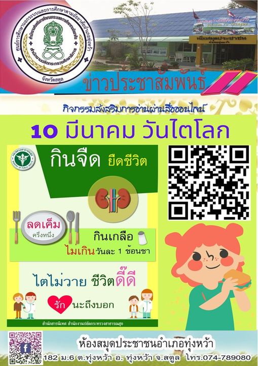 ห้องสมุดประชาชนอำเภอทุ่งหว้า ส่งเสริมการอ่านออนไลน์📚📖 \"10 มีนาคม วันไตโลก \" กินจืด ยืดชีวิต