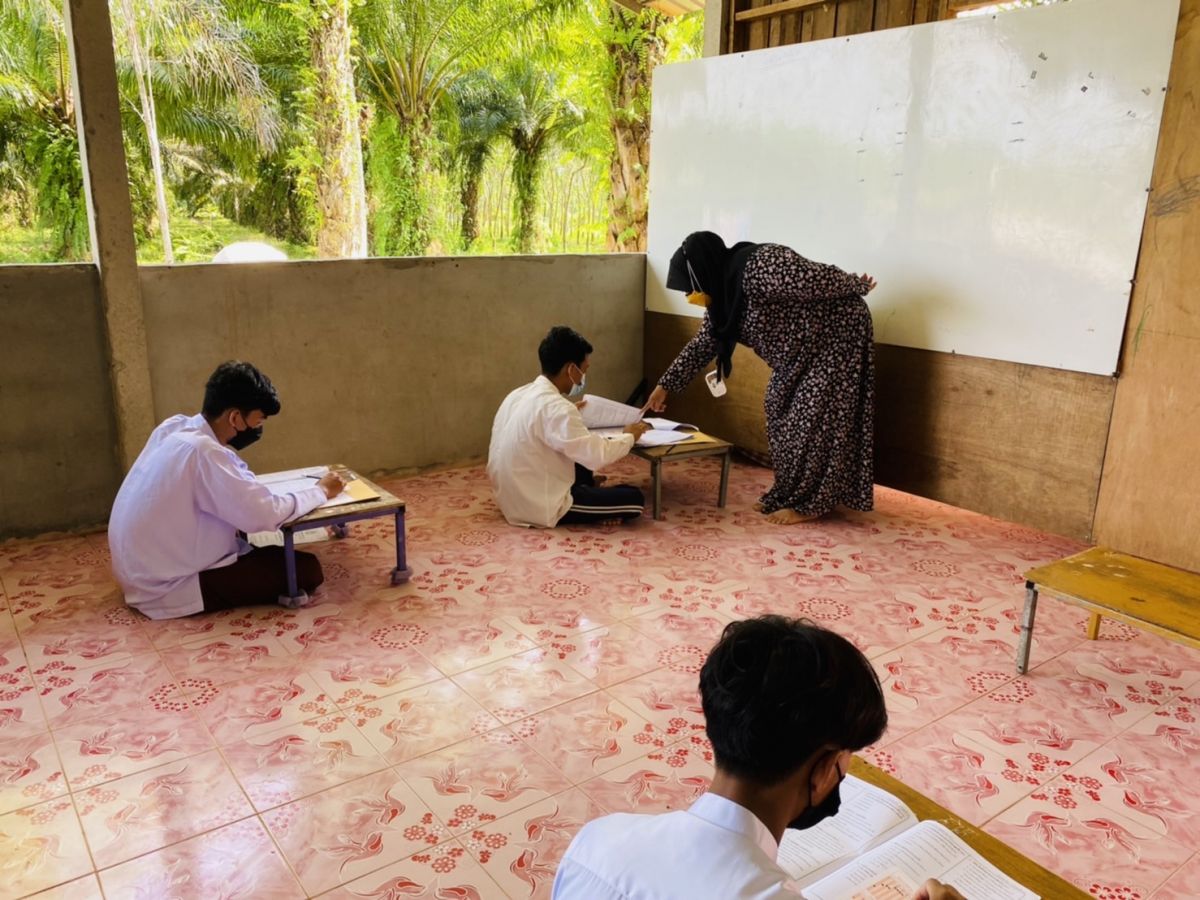 นางสาวอาฟีฟา อาลีมิง และนายยัฟรี หมันเส็น ครูอาสาสมัครประจำสถาบันศึกษาปอเนาะ ได้รับมอบหมายจาก นางเนาวรัตน์ ศรีหมั่น ครูชำนาญการรักษาการ ในตำแหน่ง ผู้อำนวยการ กศน.อำเภอควนโดน ดำเนินการสอบวัดผลสัมฤทธิ์ ปลายภาคเรียนที่ 2 ปีการศึกษา 2564 นักศึกษาระดับมัธยมศึกษาตอนต้น ณ สถาบันศึกษาปอเนาะท่องจำอัลกุรอานอัลฟิรเดาส์ ตำบลควนสตอ อำเภอควนโดน จังหวัดสตูล โดยกระบวนการดำเนินการจัดกิจกรรมเป็นไปตามแนวปฏิบัติการควบคุมและป้องกันการแพร่ระบาดของโรคติดเชื้อไวรัสโคโรน่า 2019 อย่างเคร่งครัด