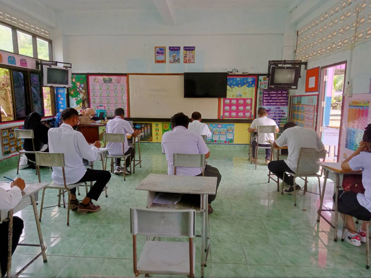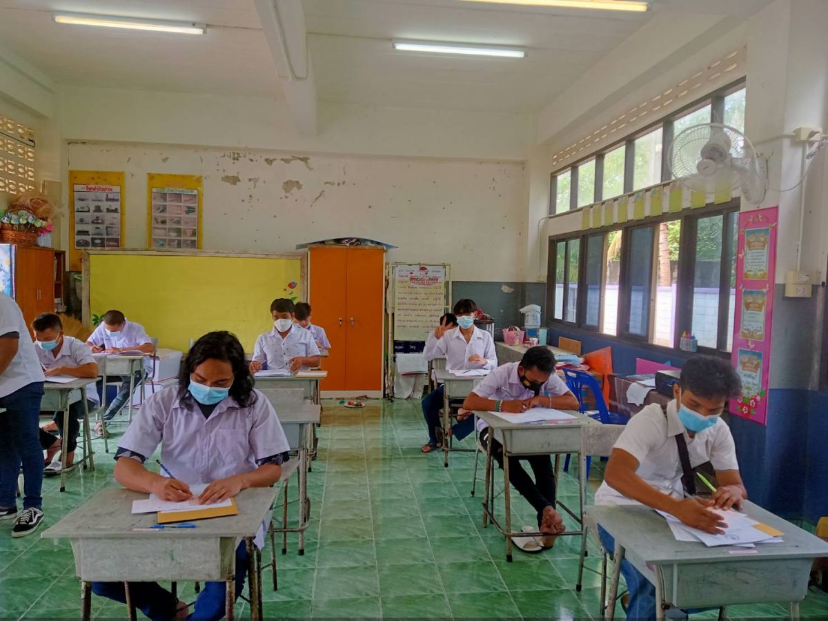 นางวนิดา รักเมือง ครู กศน.ตำบลวังประจัน ได้รับมอบหมายจาก นางเนาวรัตน์ ศรีหมั่น ครูชำนาญการรักษาการ ในตำแหน่ง ผู้อำนวยการ กศน.อำเภอควนโดน ดำเนินการสอบวัดผลสัมฤทธิ์ ปลายภาคเรียนที่ 2 ปีการศึกษา 2564 นักศึกษาระดับมัธยมศึกษาตอนปลาย ณ โรงเรียนบ้านทุ่งมะปรัง ตำบลวังประจัน อำเภอควนโดน จังหวัดสตูล โดยกระบวนการดำเนินการจัดกิจกรรมเป็นไปตามแนวปฏิบัติการควบคุมและป้องกันการแพร่ระบาดของโรคติดเชื้อไวรัสโคโรน่า 2019 อย่างเคร่งครัด