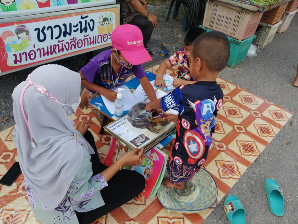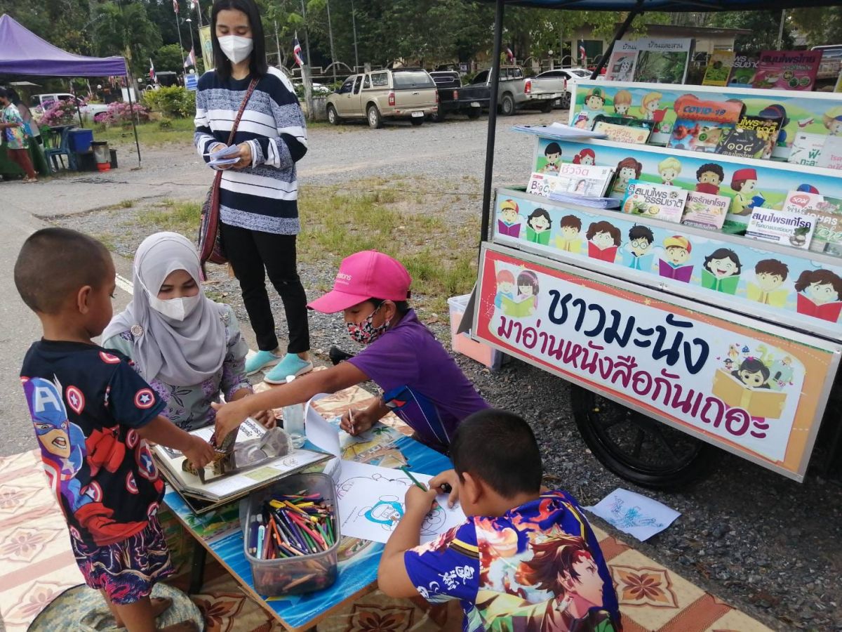 นางสาวจตุพร ทหารไทย ครูชำนาญการ รักษาการในตำแหน่งผู้อำนวยการศูนย์ กศน.อำเภอมะนัง จังหวัดสตูล มอบหมายให้นางสาวนริสรา พงค์หลง บรรณารักษ์อัตราจ้าง ห้องสมุดประชาชนอำเภอมะนัง พร้อมด้วยครู กศน.ตำบล ครูอาสาฯ กศน.ตำบลนิคมพัฒนา #ลงพื้นที่กิจกรรมส่งเสริมการอ่านห้องสมุดเคลื่อนสำหรับชาวตลาดของสมเด็จพระเทพรัตนราชสุดาฯ สยามบรมราชกุมารี โดยมีกิจรรมส่งเสริมการอ่านหลายรูปแบบ