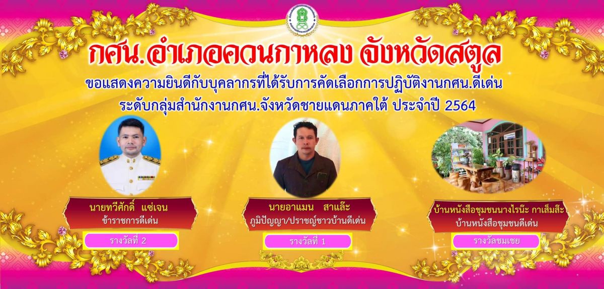 กศน.อำเภอควนกาหลง #ขอแสดงความยินดี กับบุคลากรที่ได้รับการคัดเลือกการปฏิบัติงาน กศน.ดีเด่น ระดับกลุ่มสำนักงาน กศน.จังหวัดชายแดนภาคใต้ ตามสาขา ดังนี้