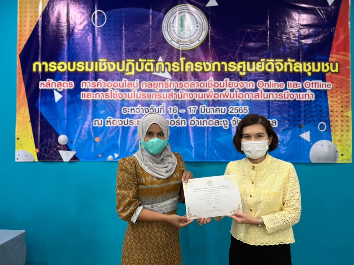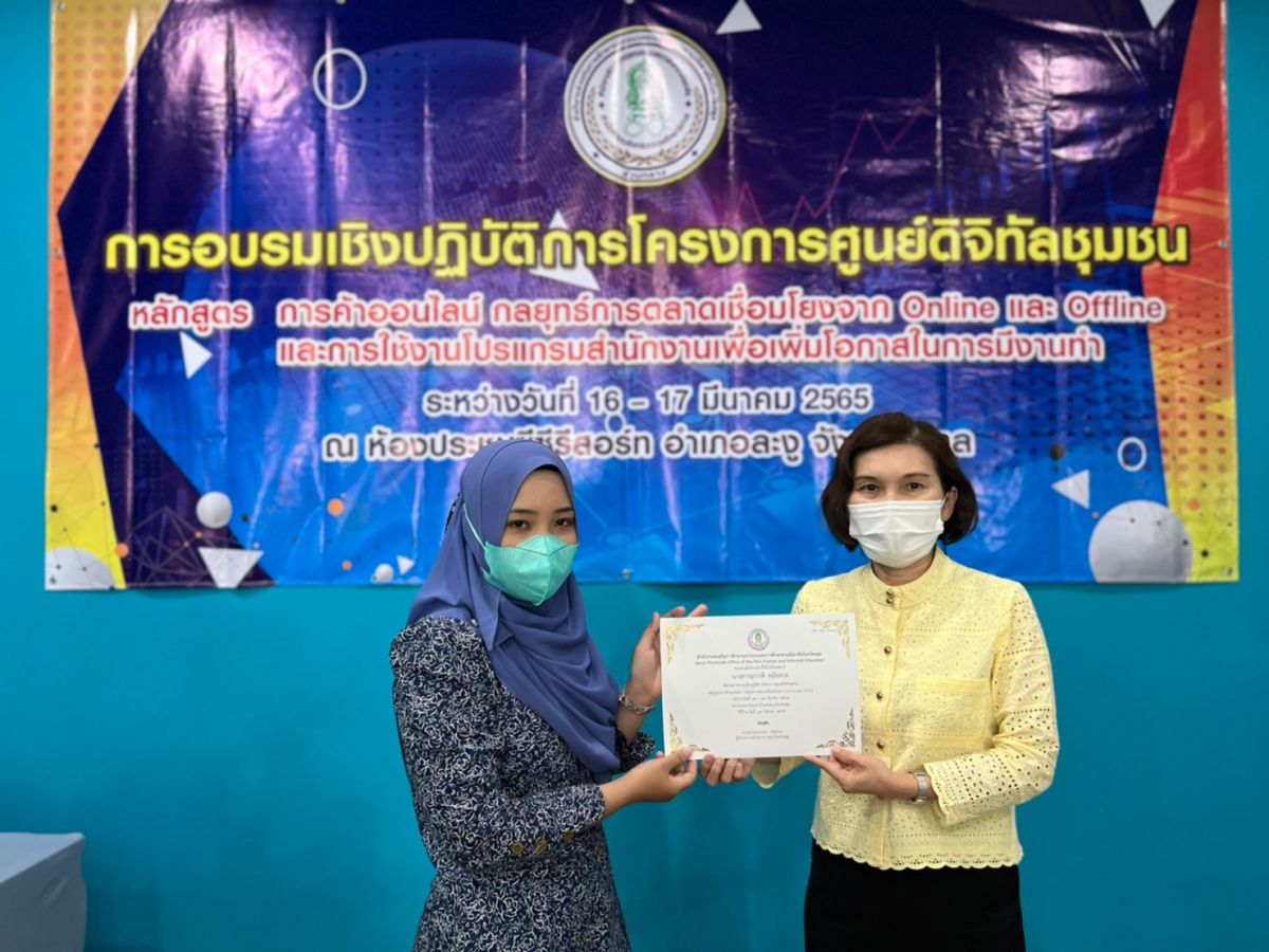 นางสาวนุรวาตี หมัดสกุล ครู กศน.ตำบลย่านซื่อ และนางสาวรมณีย์ ทิ้งปากถ้ำ ครูอาสาสมัคร กศน.ตำบลย่านซื่อ ได้รับมอบหมายจาก นางเนาวรัตน์ ศรีหมั่น ครูชำนาญการรักษาการ ในตำแหน่ง ผู้อำนวยการ กศน.อำเภอควนโดน อบรมเชิงปฏิบัติโครงการศูนย์ดิจิทัลชุมชน หลักสูตร การค้าออนไลน์ กลยุทธ์การตลาดเชื่อมโยงจาก Online และ Offine และการใช้งานโปรแกรมสำนักงานเพื่อเพิ่มโอกาสในการมีงานทำ ระหว่างวันที่ 16 - 17 มีนาคม 2565 ณ ห้องประชุมซีซีรีสอร์ท อำเภอละงู จังหวัดสตูล โดยกระบวนการดำเนินการจัดกิจกรรมเป็นไปตามแนวปฏิบัติการควบคุมและป้องกันการแพร่ระบาดของโรคติดเชื้อไวรัสโคโรน่า 2019