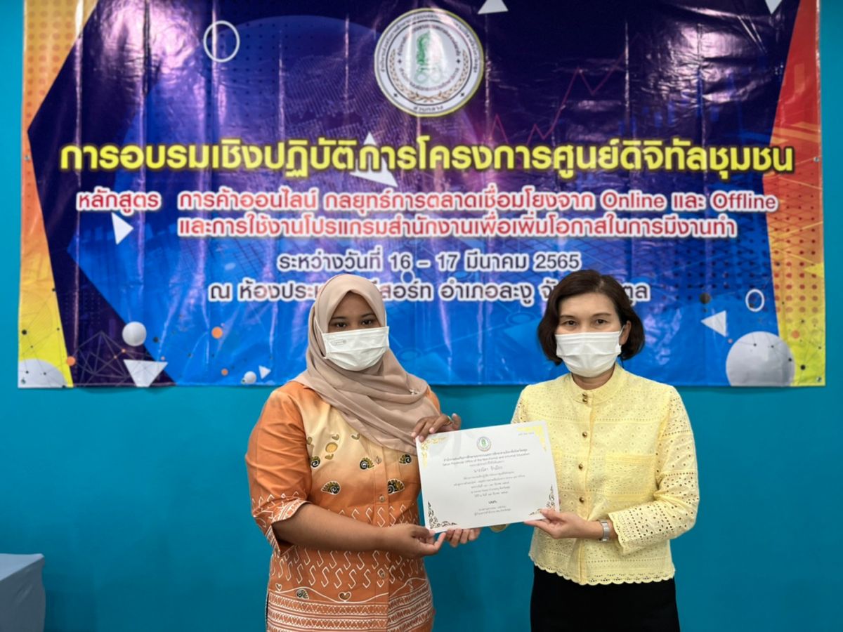 นางวนิดา รักเมือง ครูกศน.ตำบลวังประจัน ได้รับมอบหมายจาก นางเนาวรัตน์ ศรีหมั่น ครูชำนาญการรักษาการ ในตำแหน่ง ผู้อำนวยการ กศน.อำเภอควนโดน อบรมเชิงปฏิบัติโครงการศูนย์ดิจิทัลชุมชน หลักสูตร การค้าออนไลน์ กลยุทธ์การตลาดเชื่อมโยงจาก Online และ Offine และการใช้งานโปรแกรมสำนักงานเพื่อเพิ่มโอกาสในการมีงานทำ ระหว่างวันที่ 16 - 17 มีนาคม 2565 ณ ห้องประชุมซีซีรีสอร์ท อำเภอละงู จังหวัดสตูล โดยกระบวนการดำเนินการจัดกิจกรรมเป็นไปตามแนวปฏิบัติการควบคุมและป้องกันการแพร่ระบาดของโรคติดเชื้อไวรัสโคโรน่า 2019