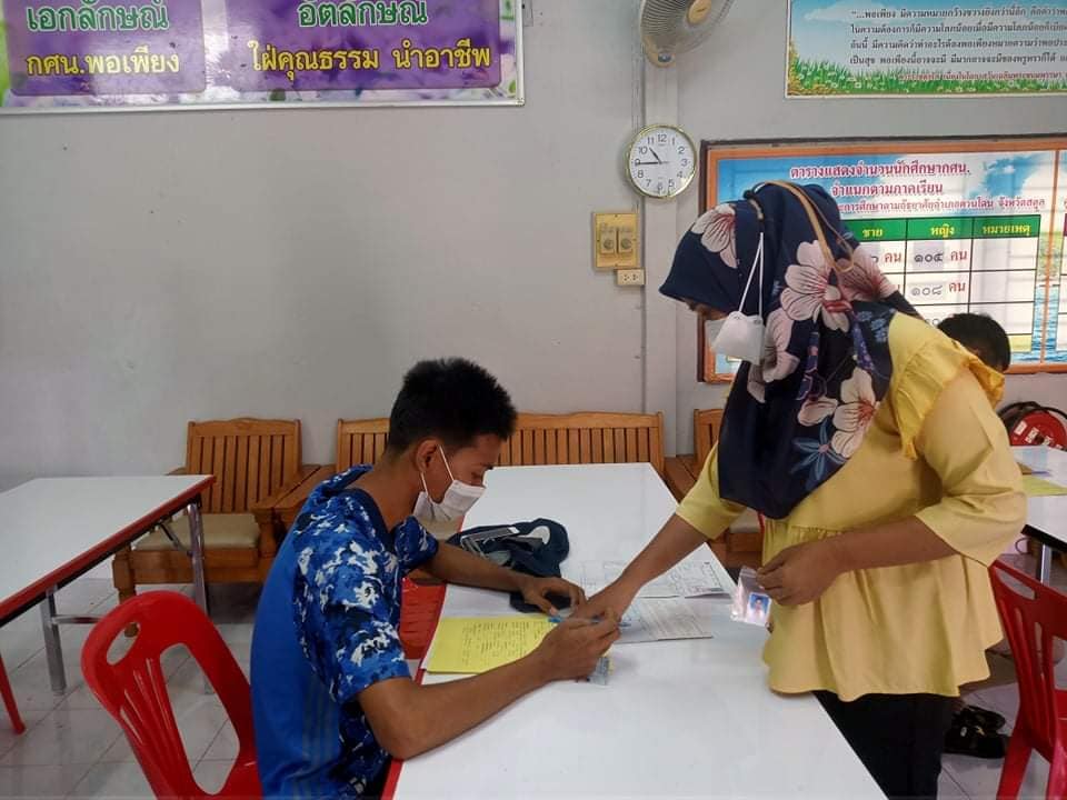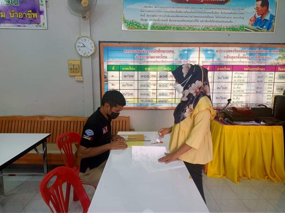 นางสาวฮาบีบะห์ เจ๊ะสมอเจ๊ะ ครู กศน.ตำบลควนโดน ได้รับมอบหมาย จากนางเนาวรัตน์ ศรีหมั่น ครู ชำนาญการ รักษาการในตำแหน่ง ผู้อำนวยการ กศน.อำเภอควนโดน จังหวัดสตูล ได้รับสมัครนักศึกษาใหม่ ประจำภาคเรียนที่ 1/2565 โดยกระบวนการดำเนินการจัดกิจกรรมเป็นไปตามแนวปฏิบัติการควบคุมและป้องกันการแพร่ระบาดของโรคติดเชื้อไวรัสโคโรน่า 2019 ณ กศน.อำเภอควนโดน จังหวัดสตูล