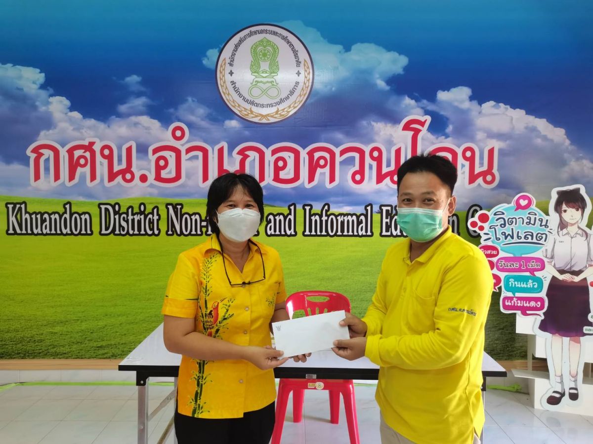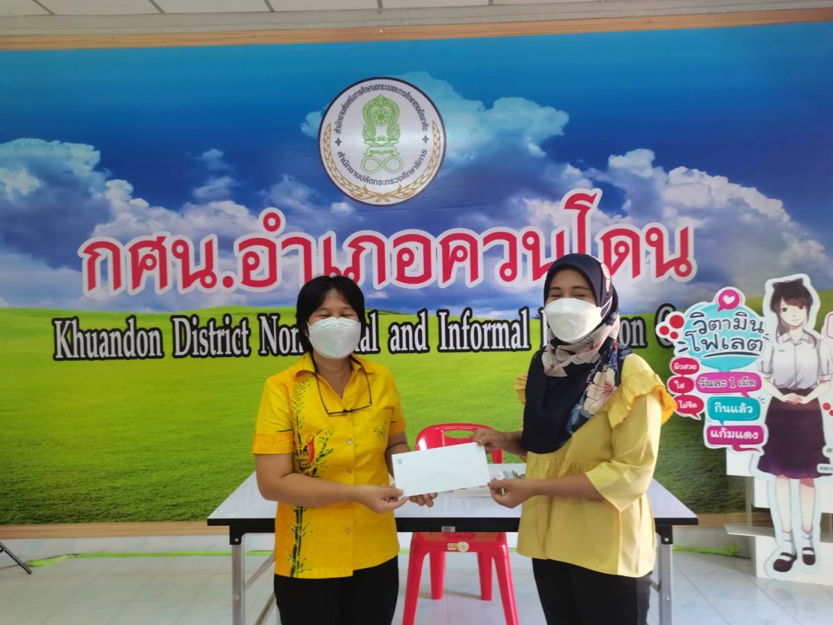 นางเนาวรัตน์ ศรีหมั่น ครูชำนาญการ รักษาการในตำแหน่ง ผู้อำนวยการ กศน.อำเภอควนโดน จังหวัดสตูล มอบสินน้ำใจ ให้กับนายยัฟรี หมันเส็น ครูอาสาประจำสถาบันศึกษาปอเนาะ และนางสาวฮาบีบะห์ เจ๊ะสมอเจ๊ะ ครู กศน.ตำบลควนโดน เพื่อเป็นขวัญและกำลังใจในการเข้าสอบครูผู้ช่วย กศน.กรณีพิเศษ ณ ห้องประชุม กศน.อำเภอควนโดน จังหวัดสตูล