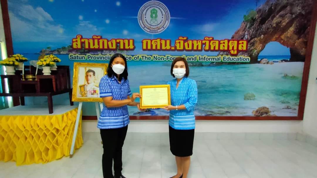 พร้อมรับมอบเกียรติบัตร กศน.ดีเด่นประจำปี 2564 ระดับกลุ่มจังหวัดชายแดนภาคใต้ และมอบอินทผลัม เพื่อสนับสนุนการถือศิลอดในเดือนรอมฎอน ปีฮิจเราะห์ศักราช 1443 เพื่อเป็นขวัญและกำลังใจให้กับบุคลากรในสถานศึกษา