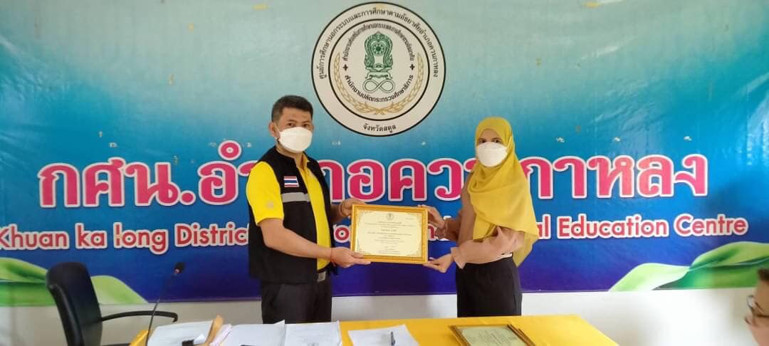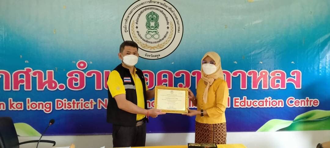 นายทวีศักดิ์ แซ่เจน ครูชำนาญการ รักษาการในตำแหน่งผู้อำนวยการศูนย์ กศน.อำเภอควนกาหลง มอบเกียรติบัตร กศน.ดีเด่นประจำปี 2564 ระดับกลุ่มจังหวัดชายแดนภาคใต้ ให้กับบุคลากรท่ีเกี่ยวข้องดังนี้