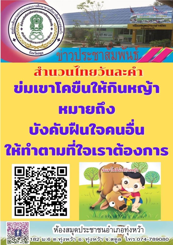 ห้องสมุดประชาชนอำเภอทุ่งหว้า ส่งเสริมการอ่านออนไลน์📚📖 \" สำนวนไทยวันละคำ ข่มเขาโคขืนให้กินหญ้า\"