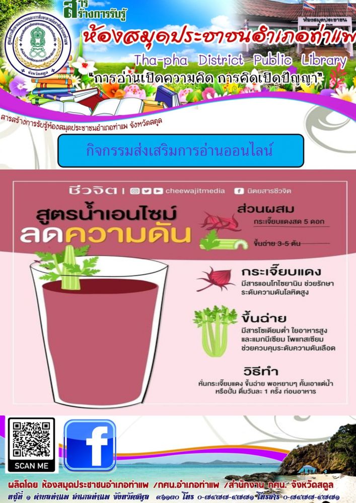 " สูตรน้ำเอนไซม์ ลดความดัน" เพื่อส่งเสริมการอ่านให้กับประชาชนทั่วไป ได้นำไปปรับใช้กับการดำเนินชีวิต