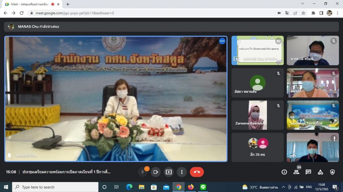 นายมรกต กันหนองผือ ผู้อำนวยการศูนย์ กศน.อำเภอละงู จังหวัดสตูล มอบหมายให้บุคลากรทางการศึกษา เข้าร่วมประชุมเตรียมความพร้อมการเปิดภาคเรียนที่ 1 ปีการศึกษา 2565 ผ่านระบบสื่ออิเล็กทรอนิกส์ (Google Meet) ณ กศน.อำเภอละงู จังหวัดสตูล